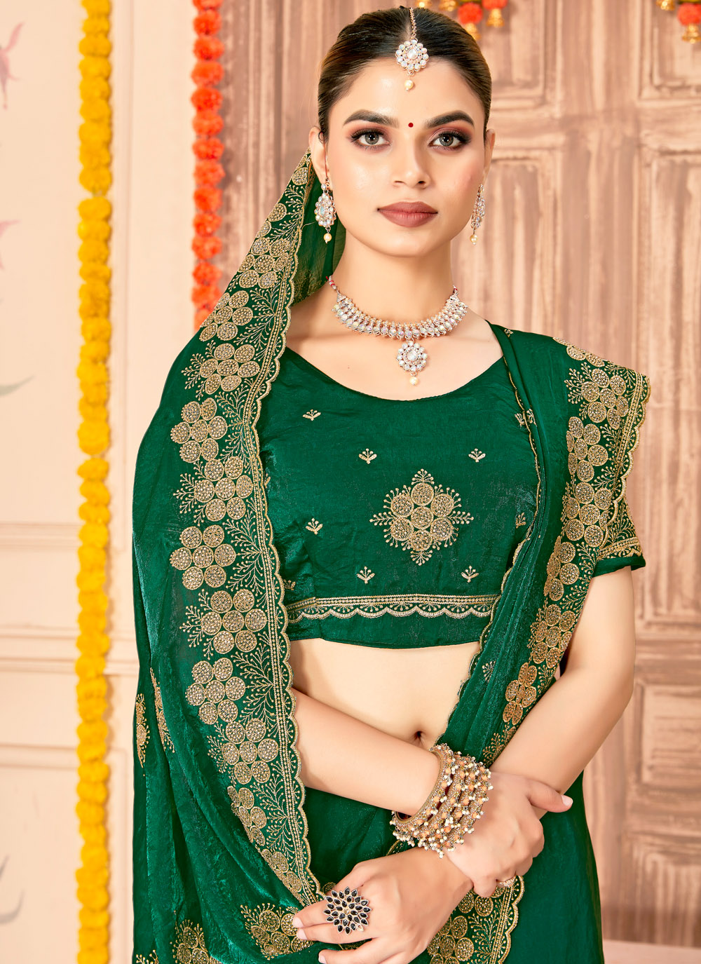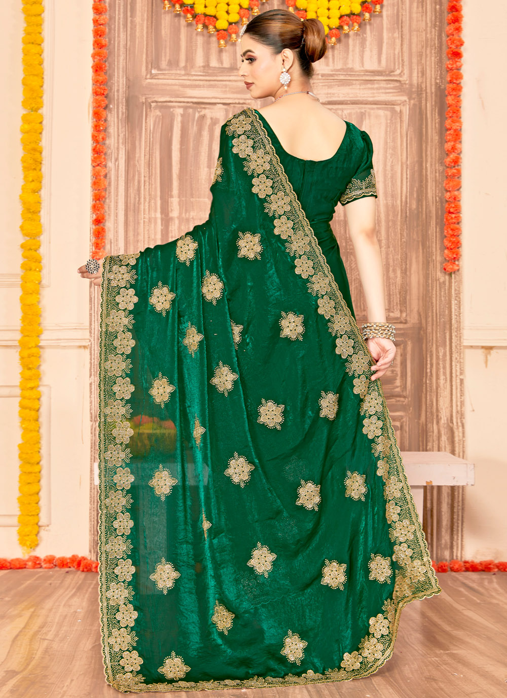 The green embroidered zari silk saree blends traditional artistry with a rich silk base, offering a sophisticated style for every special moment. Its intricate embroidery and smooth drape ensure a polished and graceful appearance without effort. Comes with matching blouse.