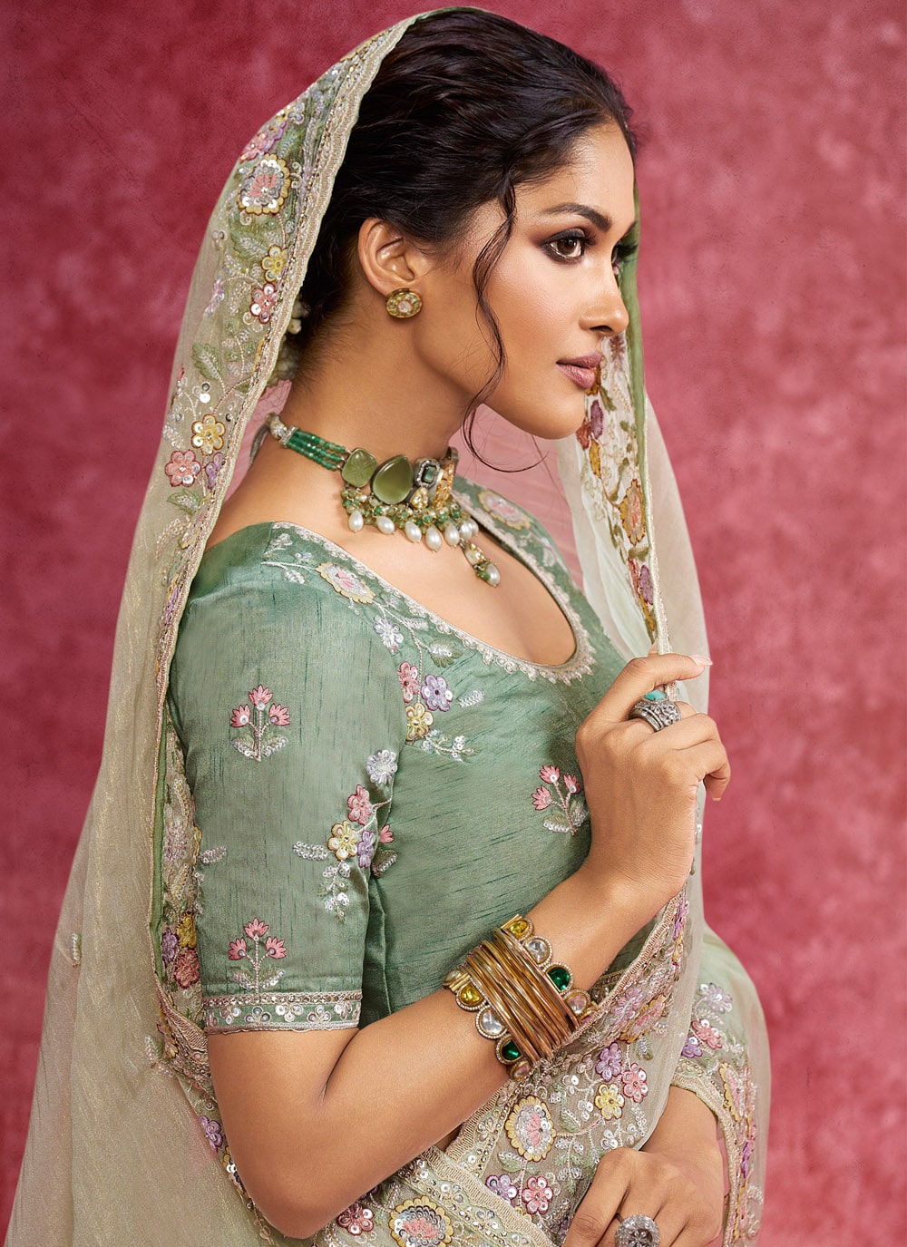 This embroidered green saree reflects traditional elegance with sequins thread artistry on fancy fabric. Its vibrant tone and detailed work give it a striking presence in any celebration. Comes with matching blouse.