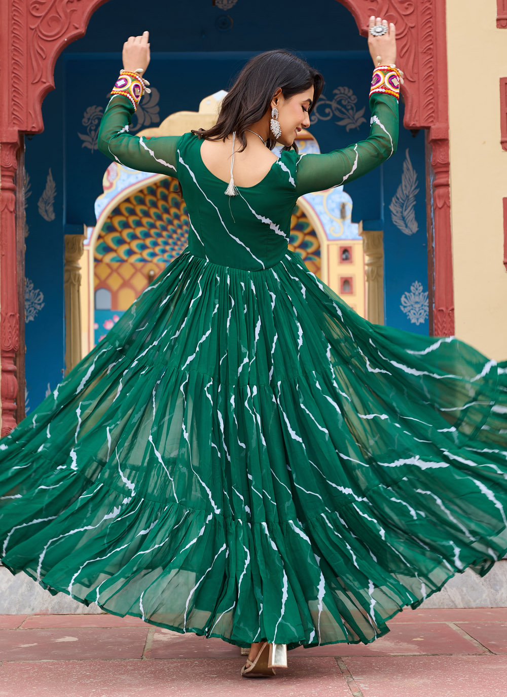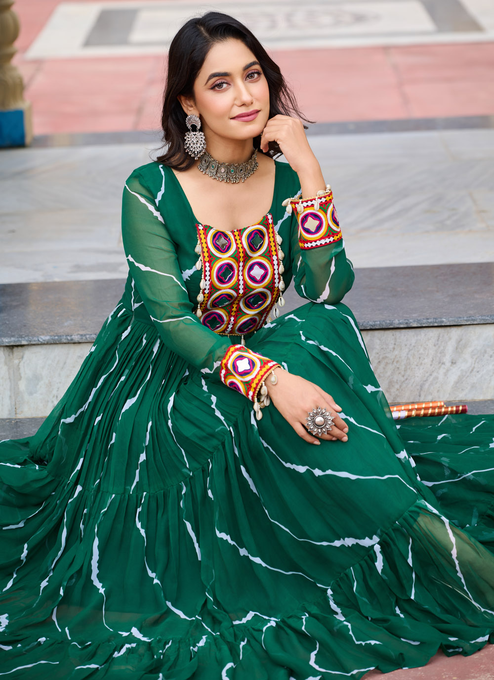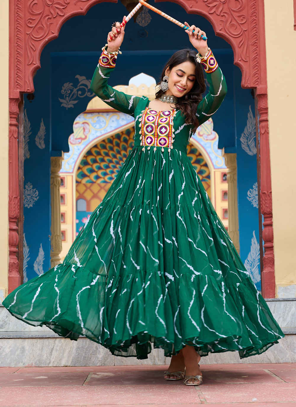 Infuse your ethnic wardrobe with fresh vibrance through this ready-to-wear green faux georgette gown. Designed with subtle all-over prints and intricate patch work, it offers a unique blend of simplicity and statement. Perfect for festive functions or cultural occasions.