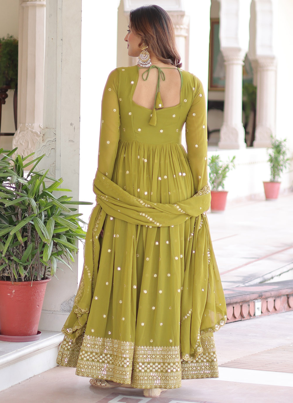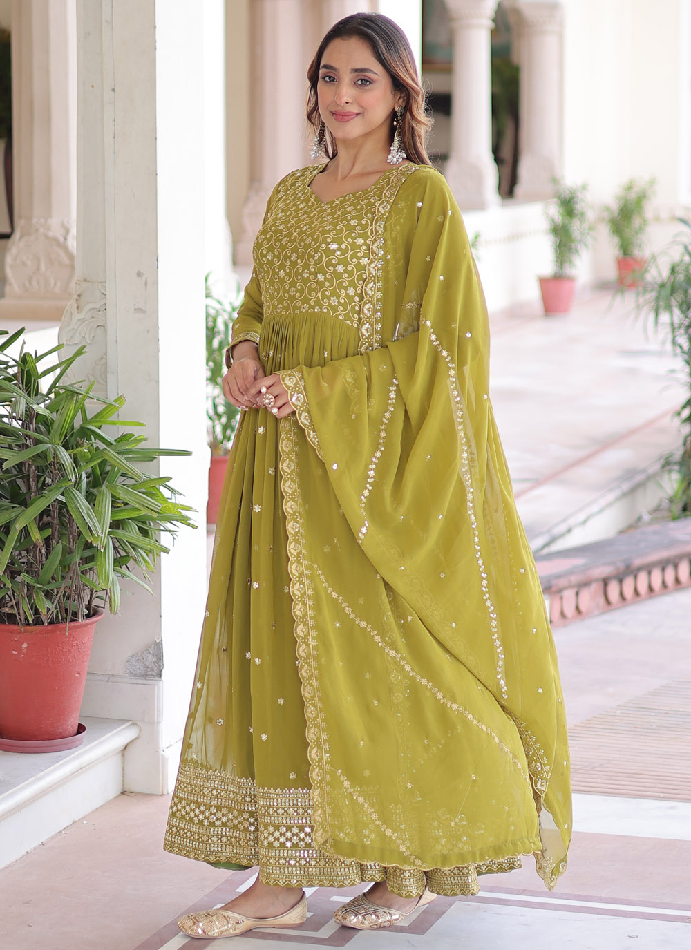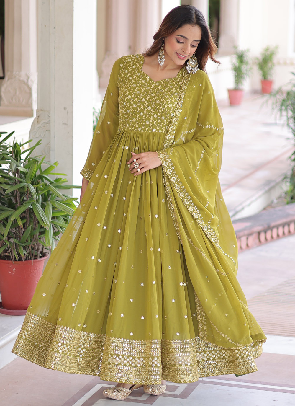This green faux georgette gown is designed with sparkling sequins and elegant zari embroidery, giving it a modern festive look. Its flowy silhouette and ready-to-wear comfort make it perfect for festivals and celebrations. Comes with matching dupatta.