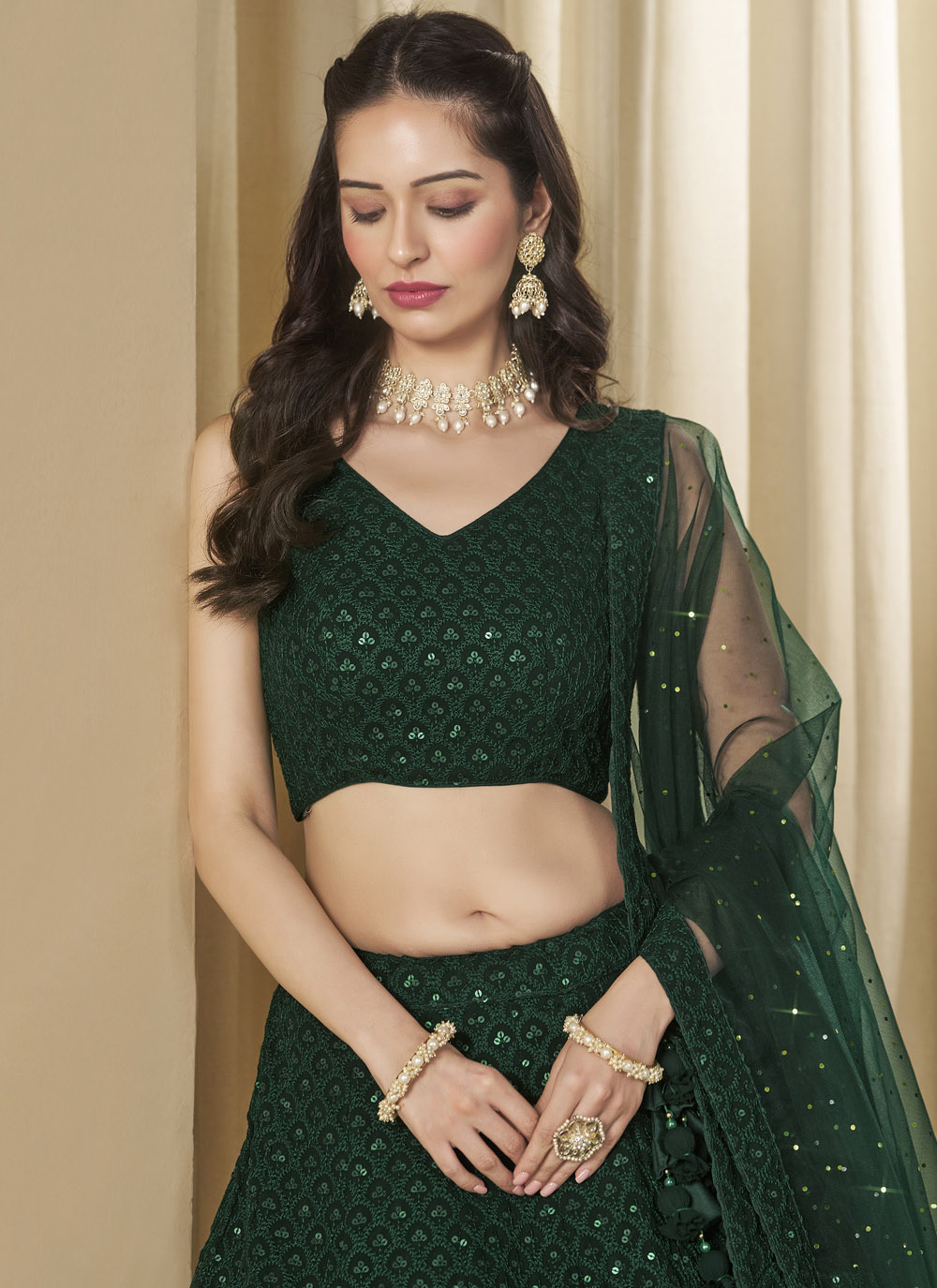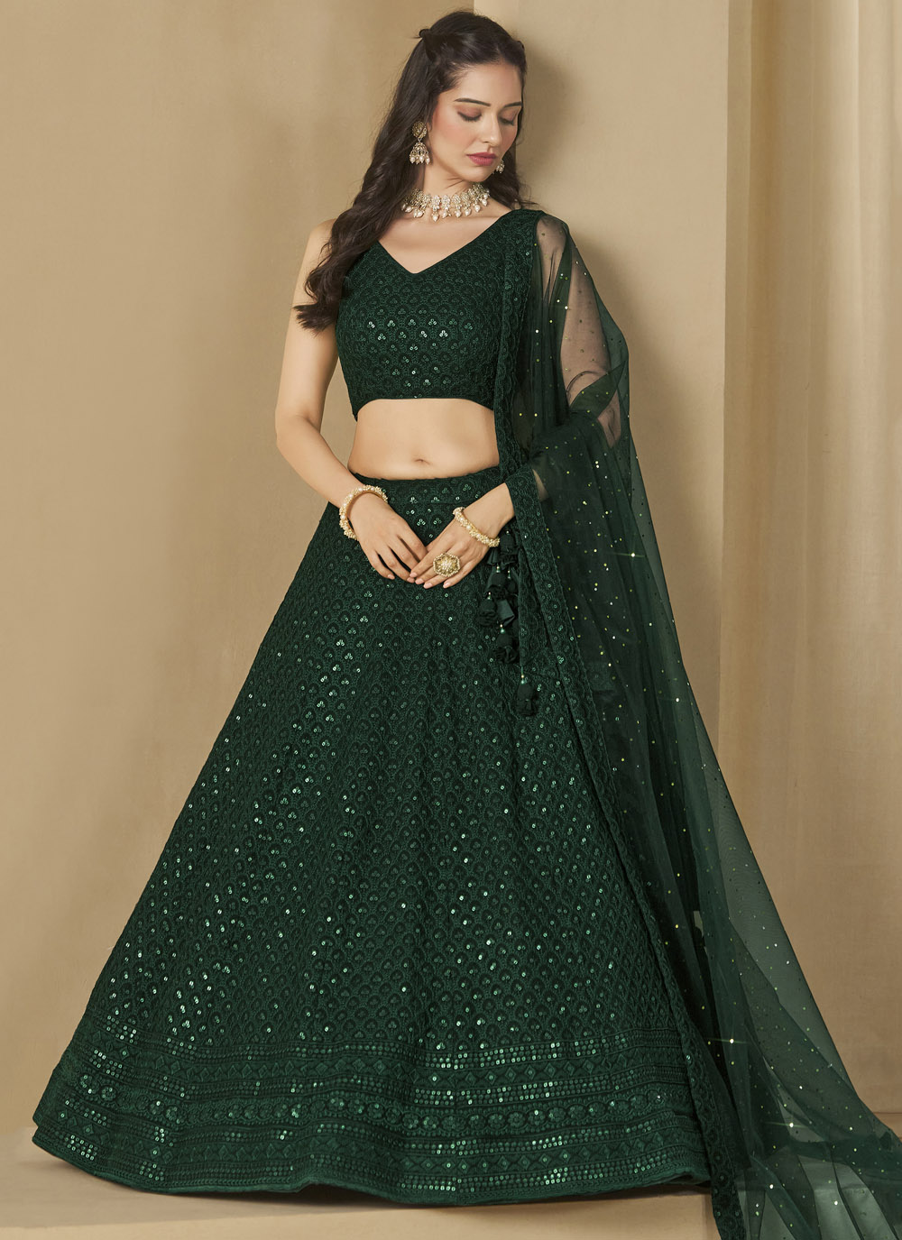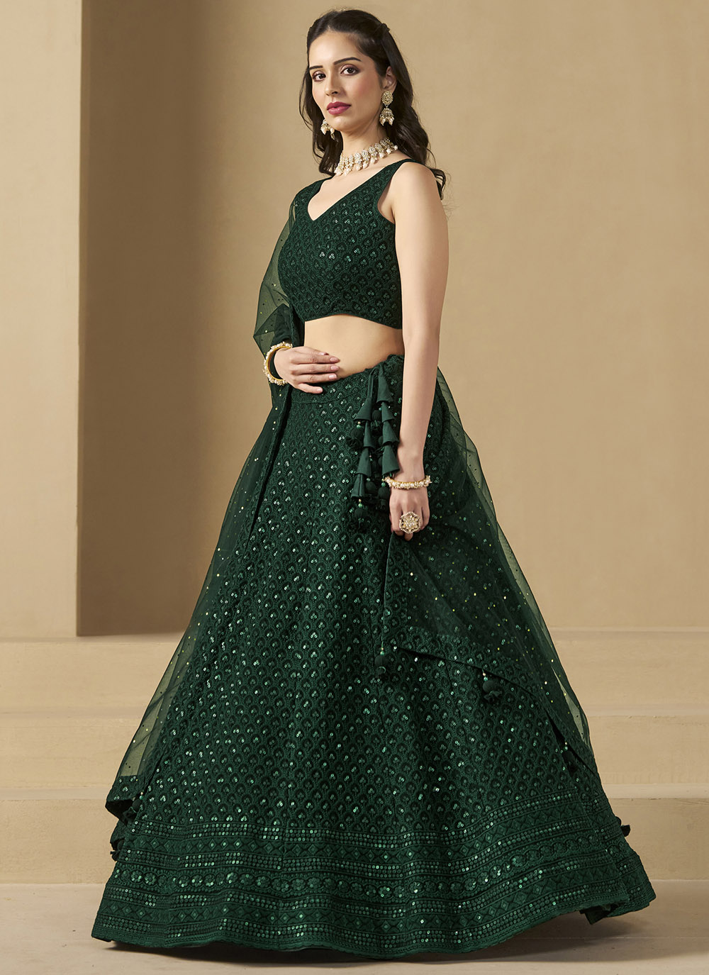 This Green A-Line Lehenga Choli in georgette is a masterpiece of delicate craftsmanship, featuring beautiful thread and sequins embroidery. The modern A-line design combined with classic ethnic elements makes it a must-have ensemble for contemporary festive looks. Comes with matching choli and dupatta.