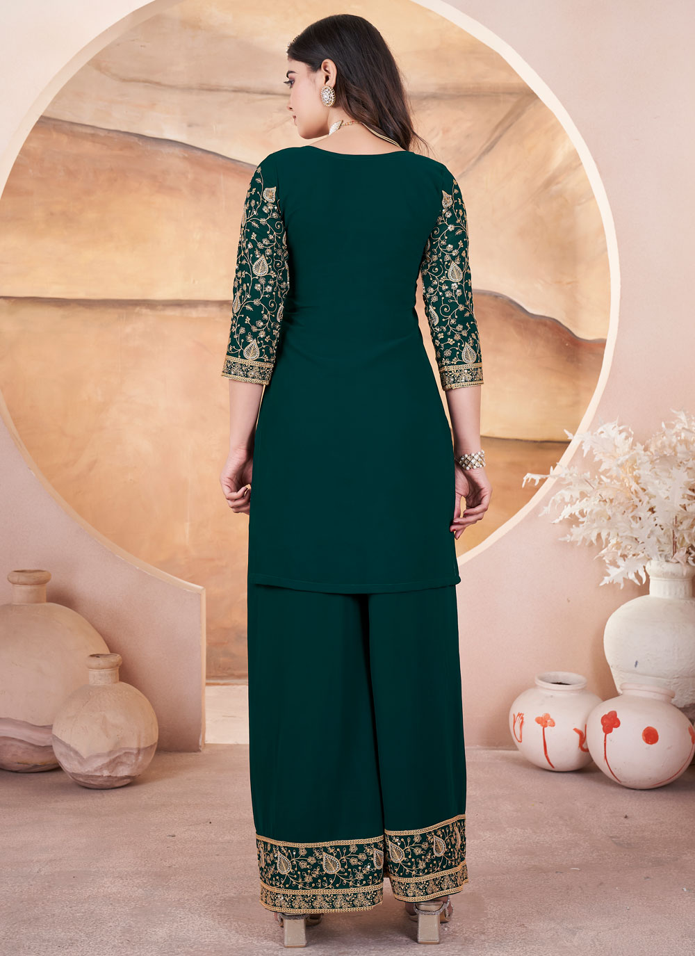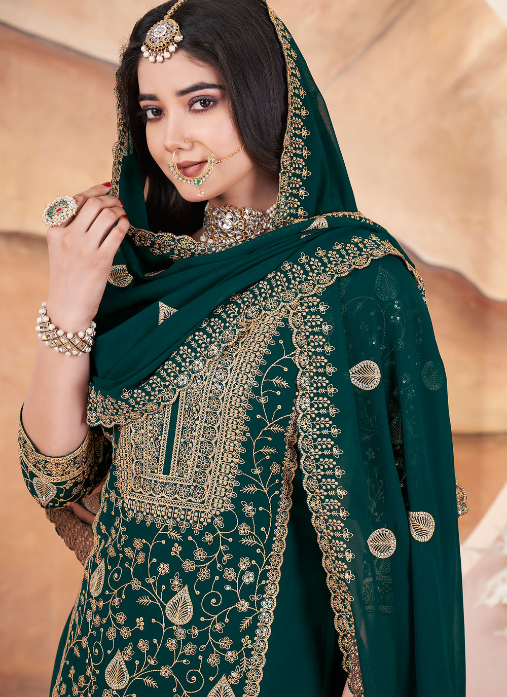 This Green Georgette Embroidered Sequins Readymade Salwar Kameez, with a matching bottom and dupatta, features intricate embroidery and shimmering sequins. Perfect for weddings and festive occasions, it offers a stunning look with comfort and style.