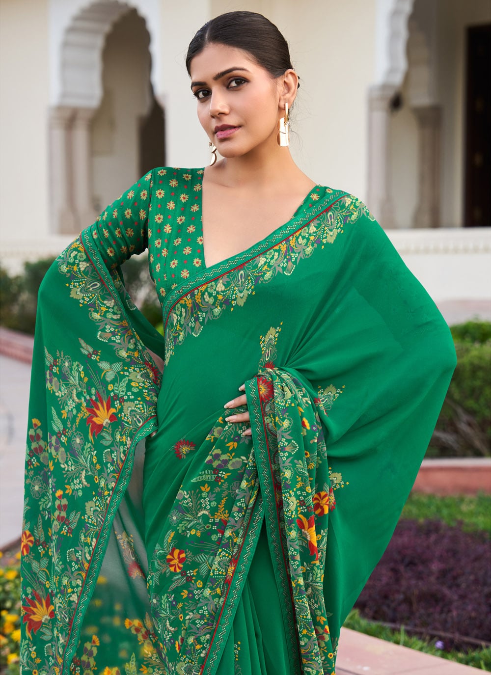 Refresh your ethnic collection with this green georgette saree, adorned with timeless printed motifs that reflect classic Indian artistry. The airy fabric drapes effortlessly, making it a beautiful choice for religious ceremonies, family functions and festive gatherings. Comes with matching blouse.