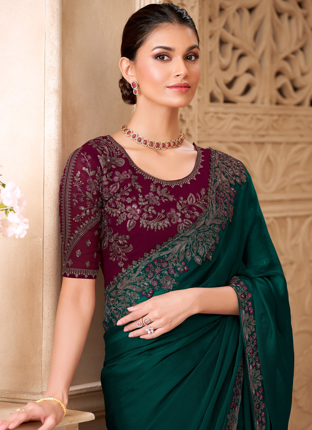 Designed to reflect heritage and beauty, this green embroidered border saree offers a flawless balance of tradition and modern styling. Comes with matching blouse.
