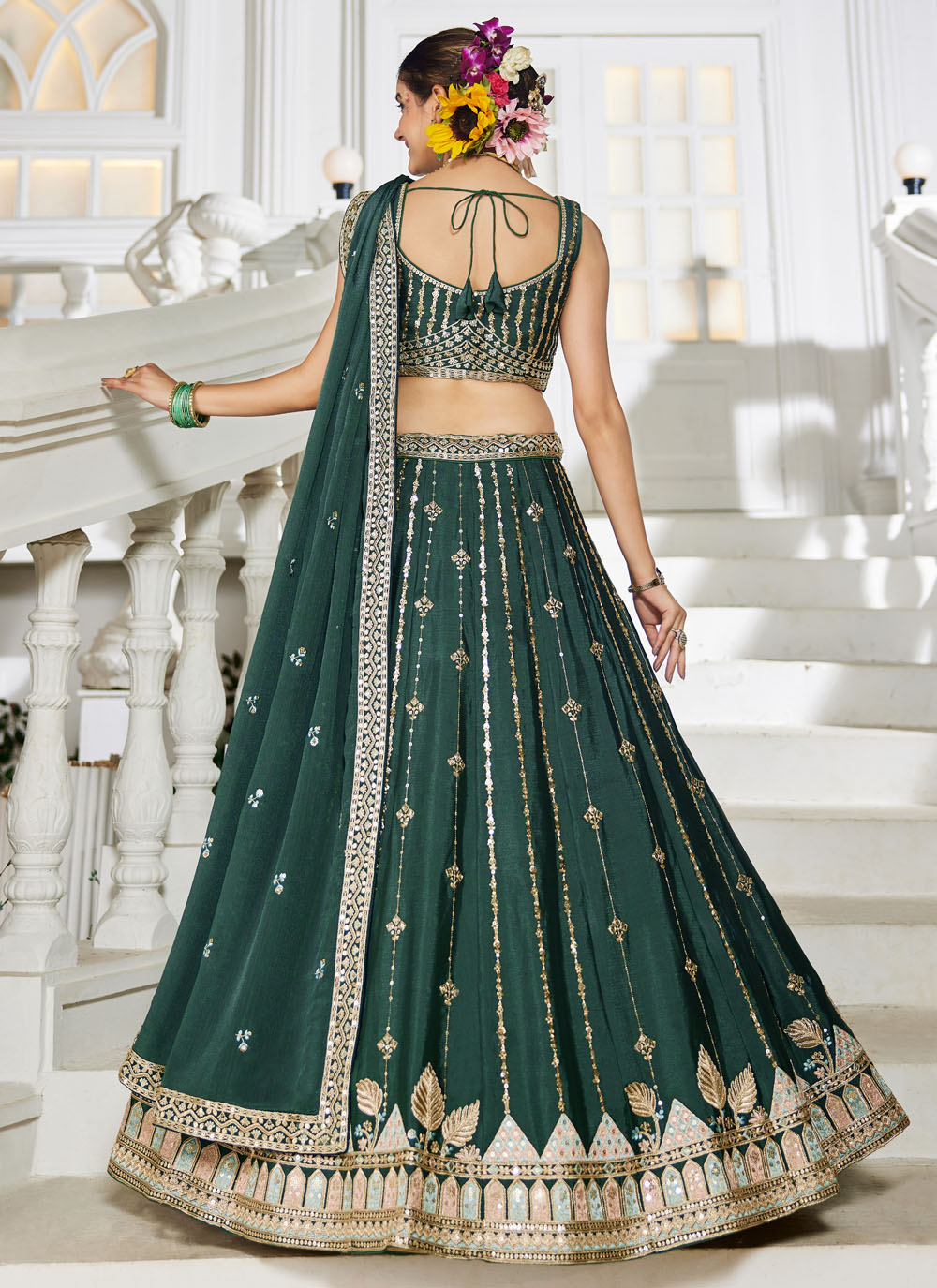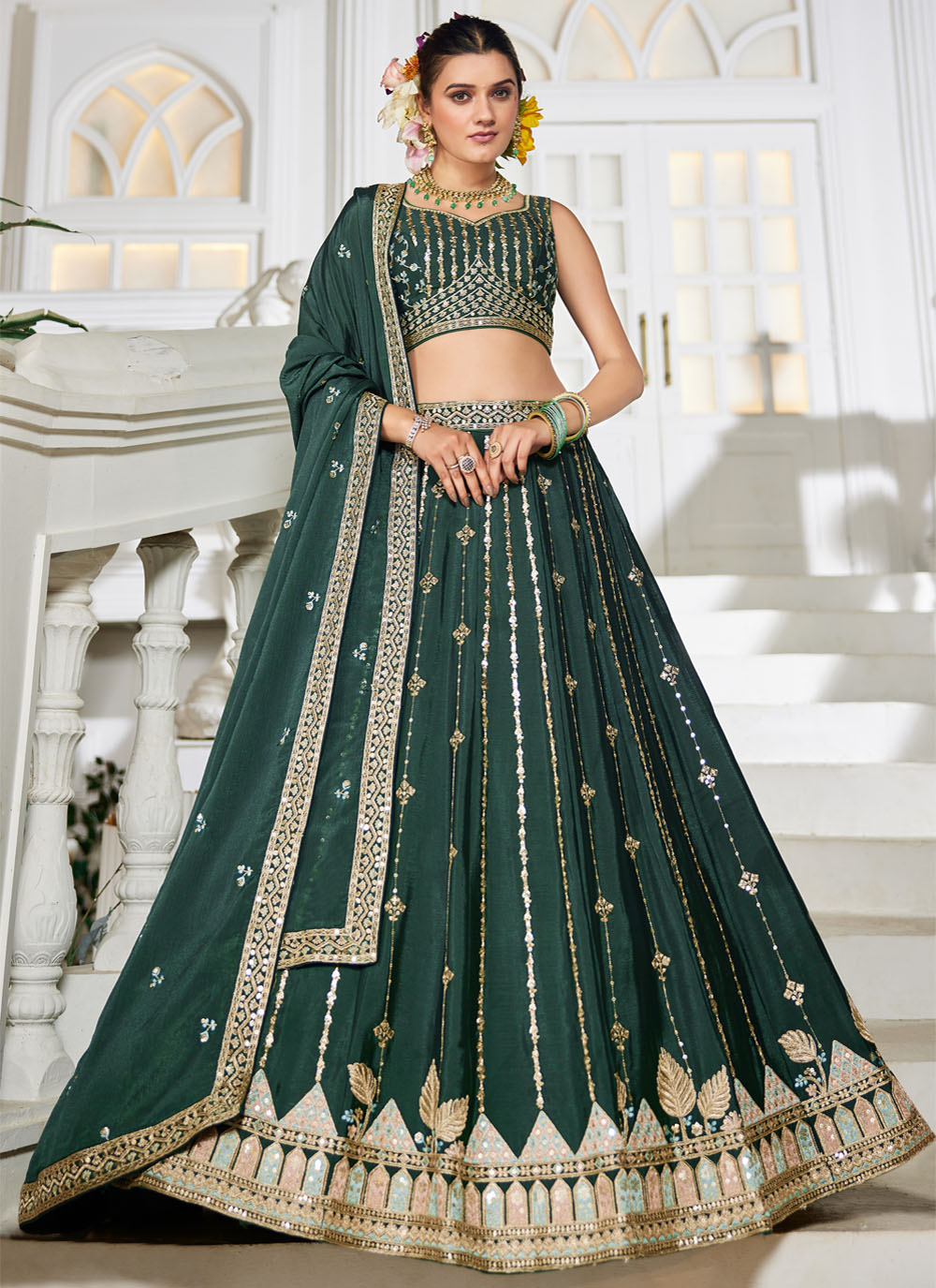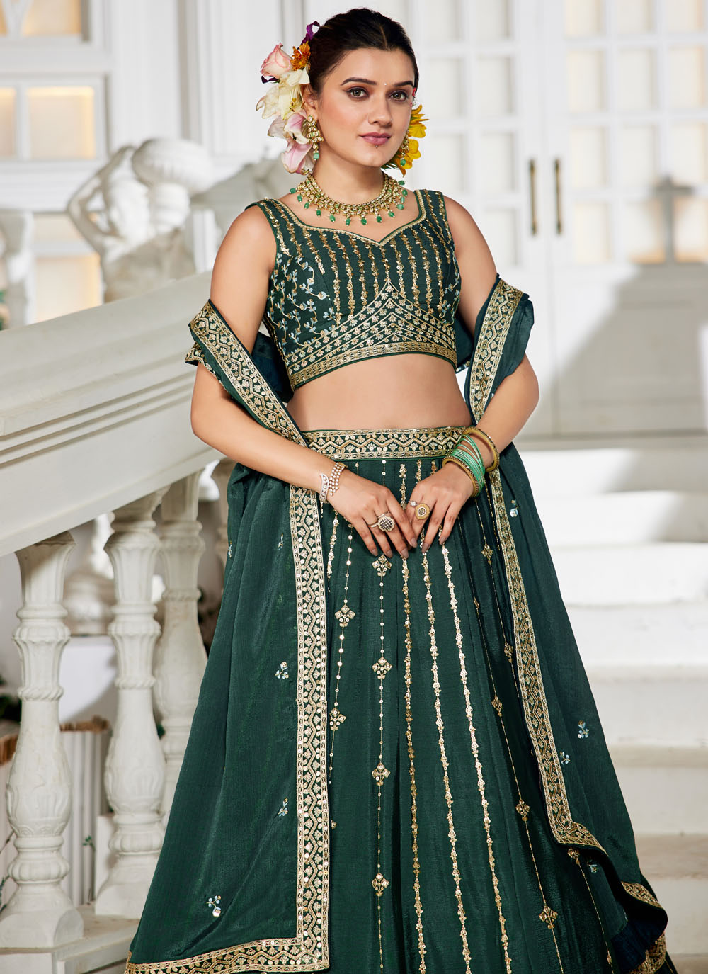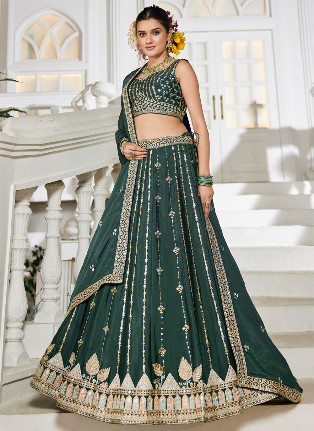 Grace the occasion in this mesmerizing Green Georgette Lehenga Choli, adorned with rich zari, sequins, and thread embroidery. The flowing silhouette, paired with intricate craftsmanship, makes it a flawless choice for weddings, receptions or festive soirées. Comes with matching choli and dupatta.