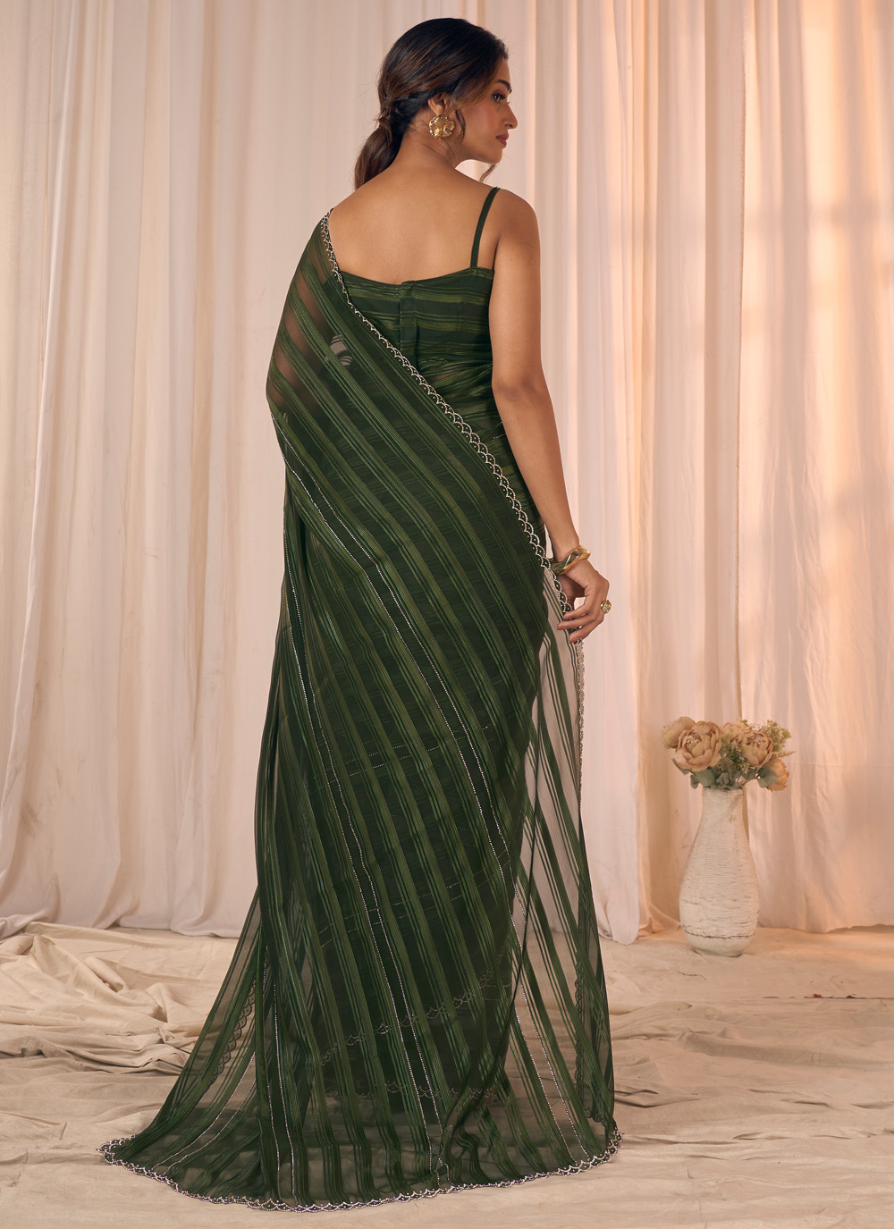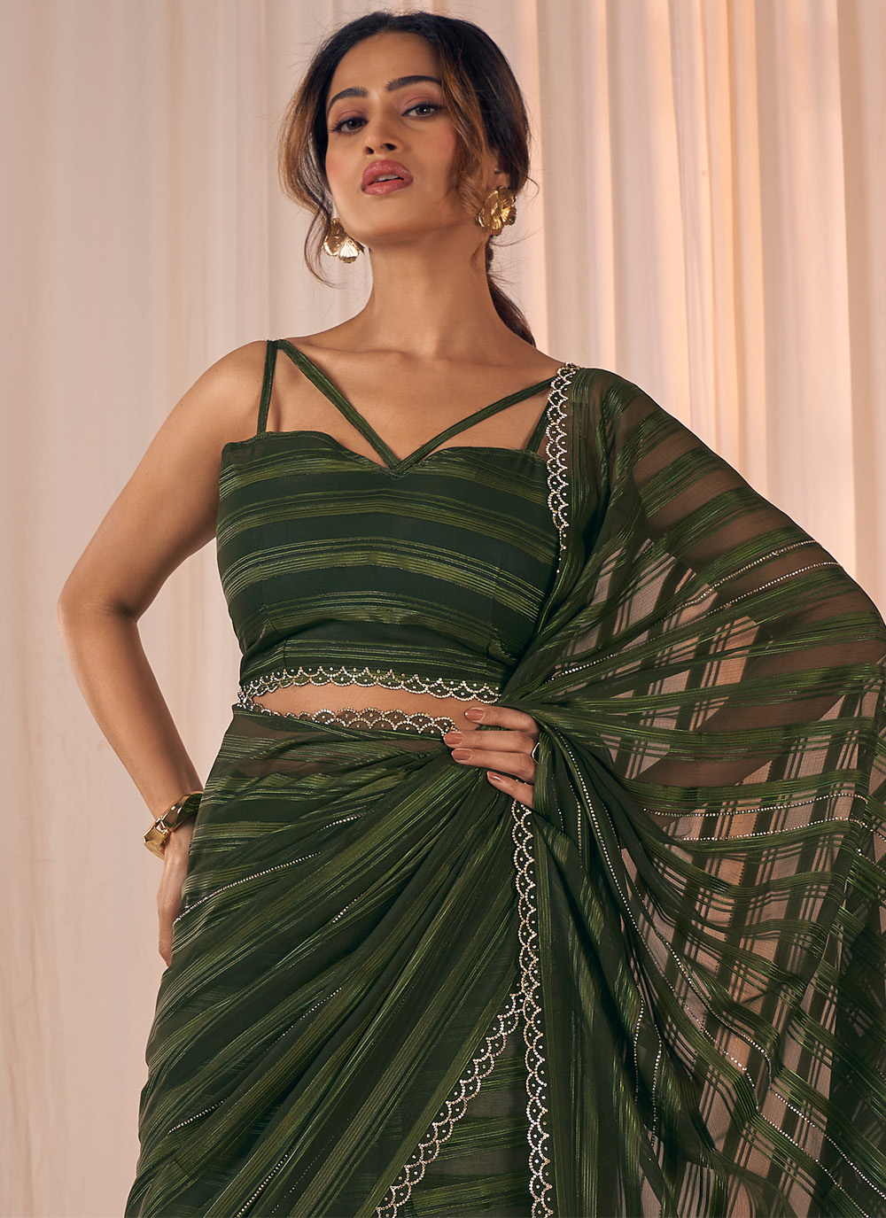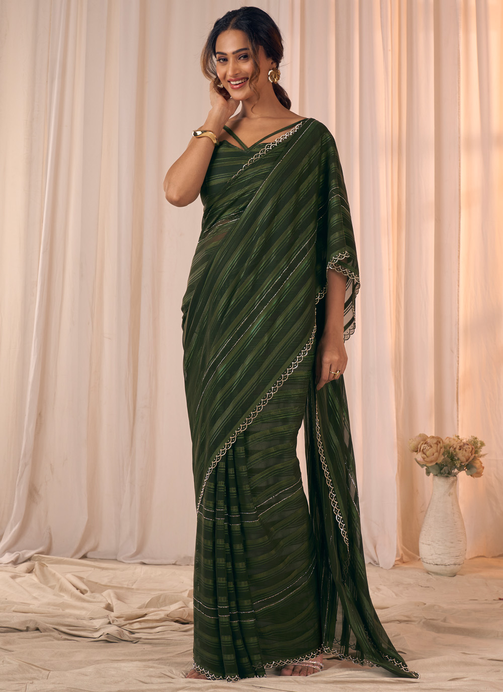 This green georgette saree brings a subtle festive glow with its elegant zarkan cutwork detailing. The lightweight drape sits beautifully on the body, creating a graceful fall perfect for weddings, evening celebrations. Comes with matching blouse.
