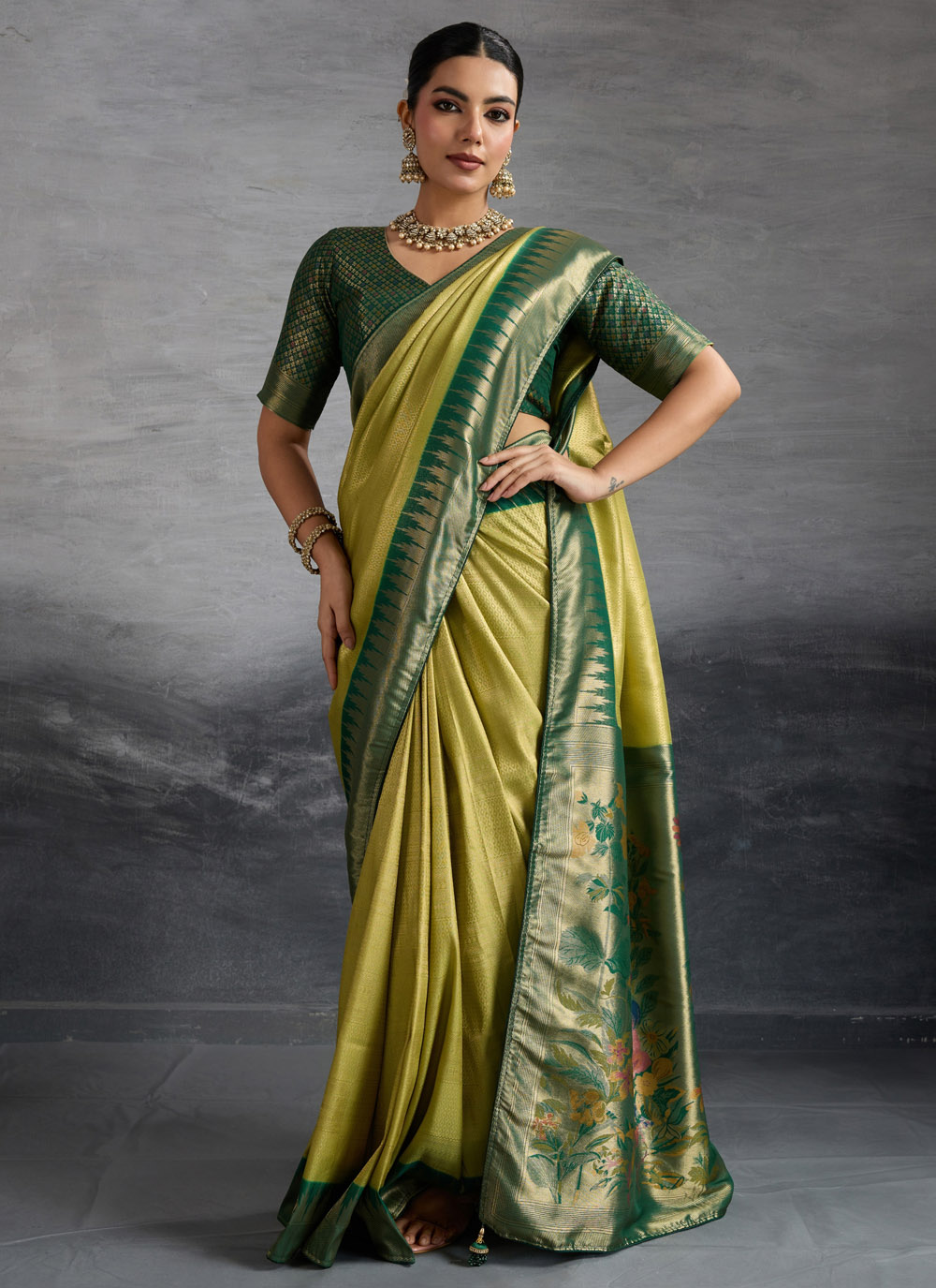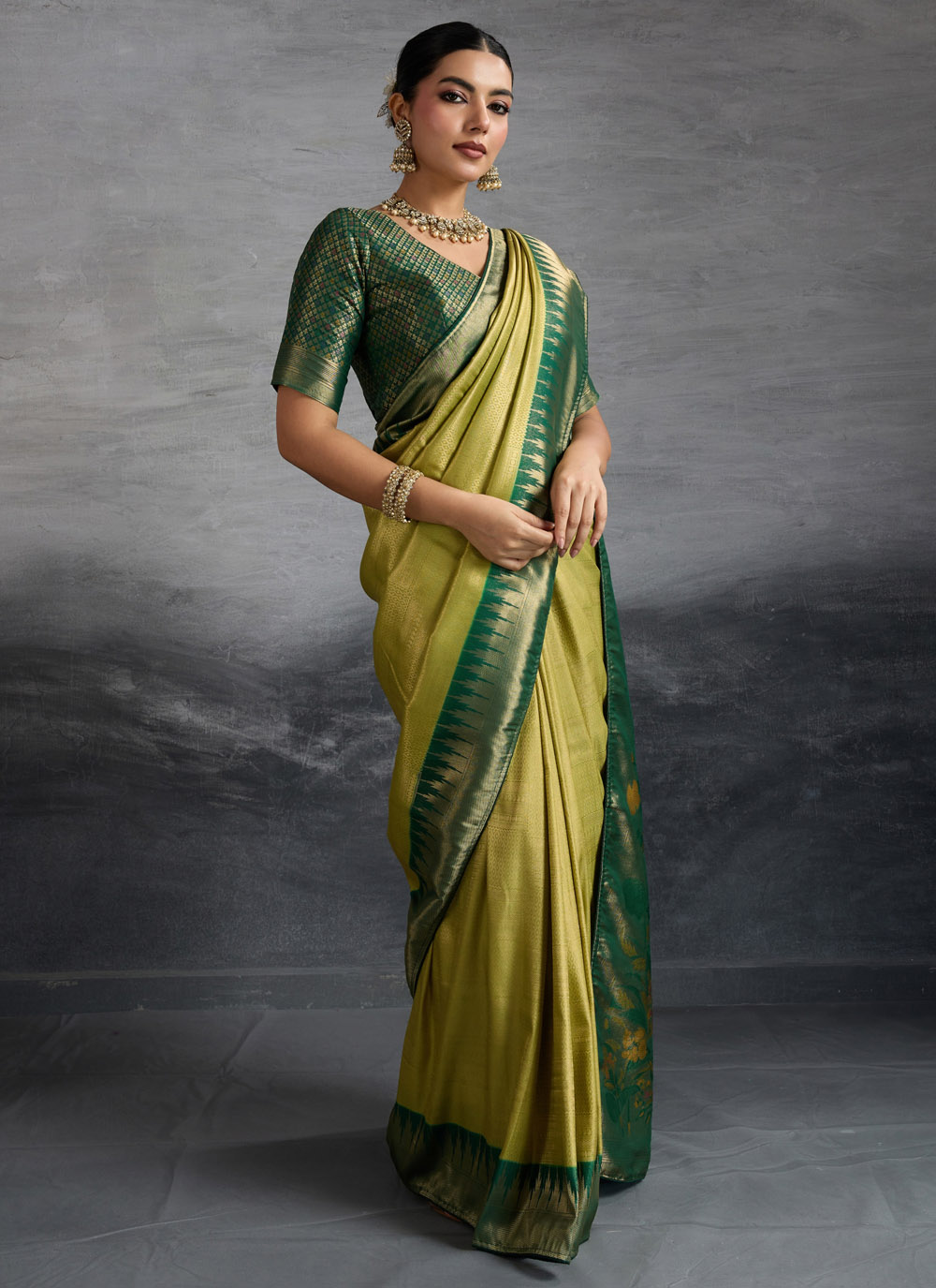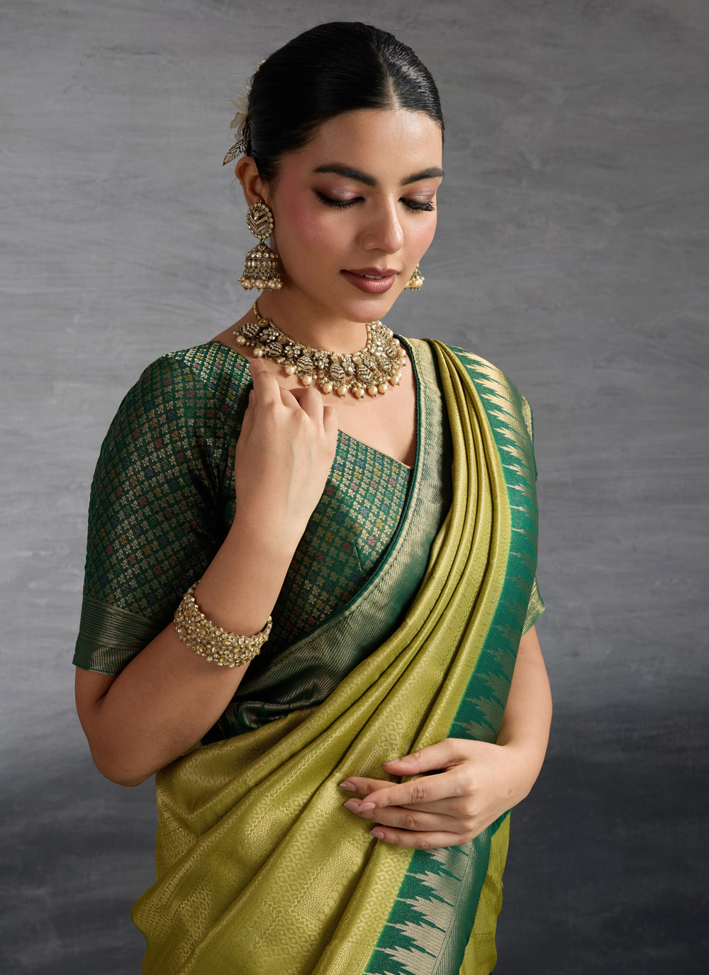 Elegance meets tradition in this green Kanjivaram silk saree. The meenakari woven motifs and shimmering zari weave beautifully complement the rich silk base. Comes with matching blouse.
