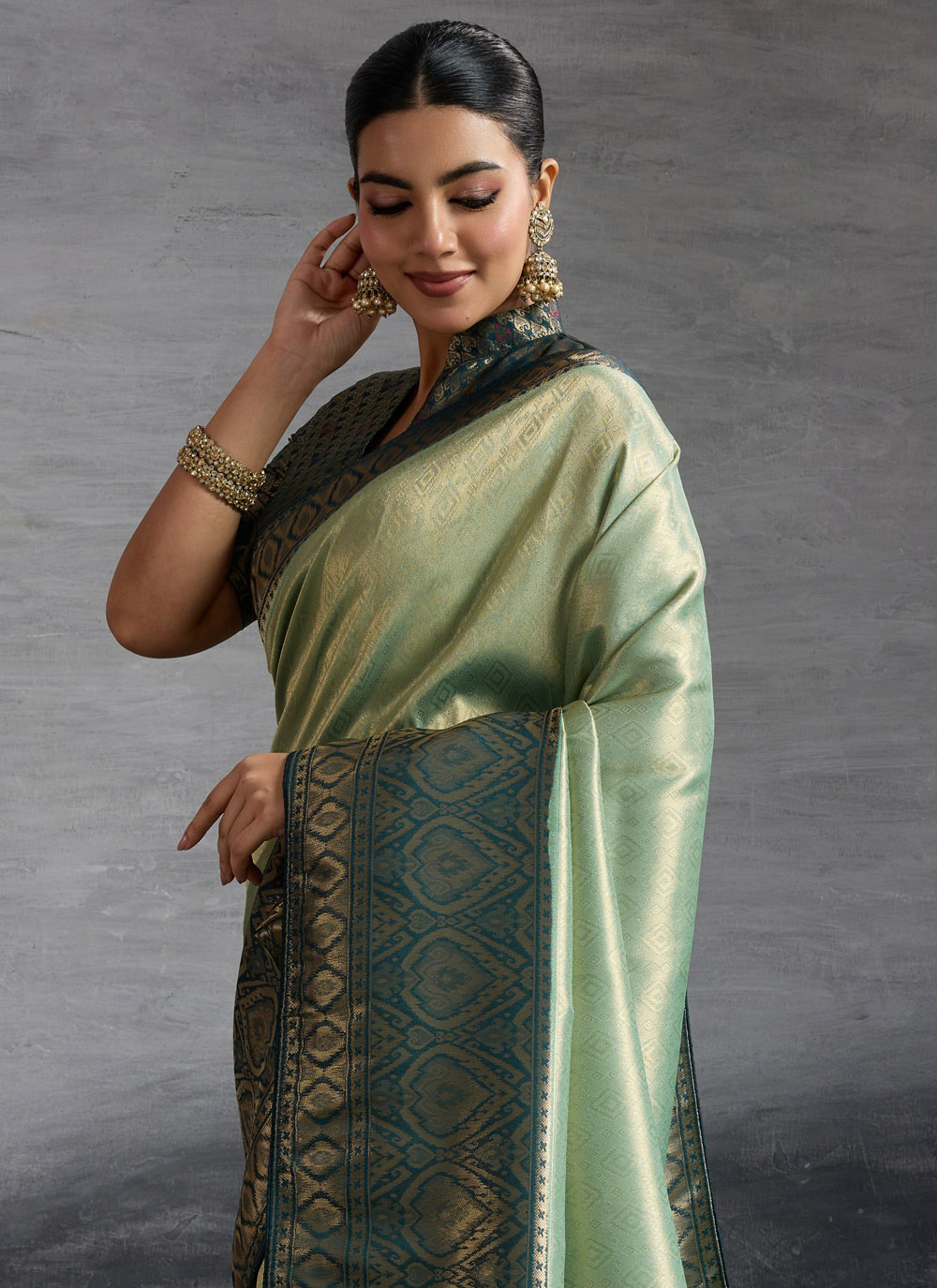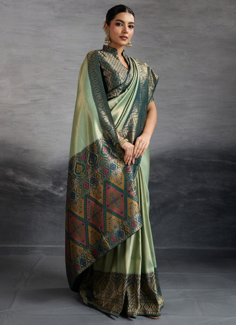 This classic Green Kanjivaram Silk Saree features intricate zari weaving that reflects cultural artistry and regal finesse. Its opulent texture and vibrant hue make it an ideal choice for festivals, poojas, and special events. Comes with matching blouse.