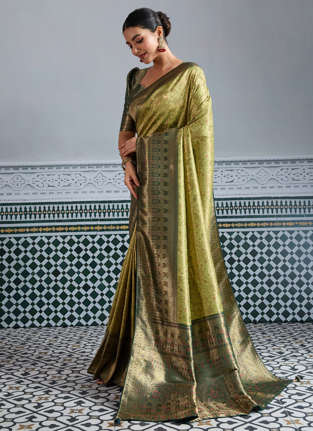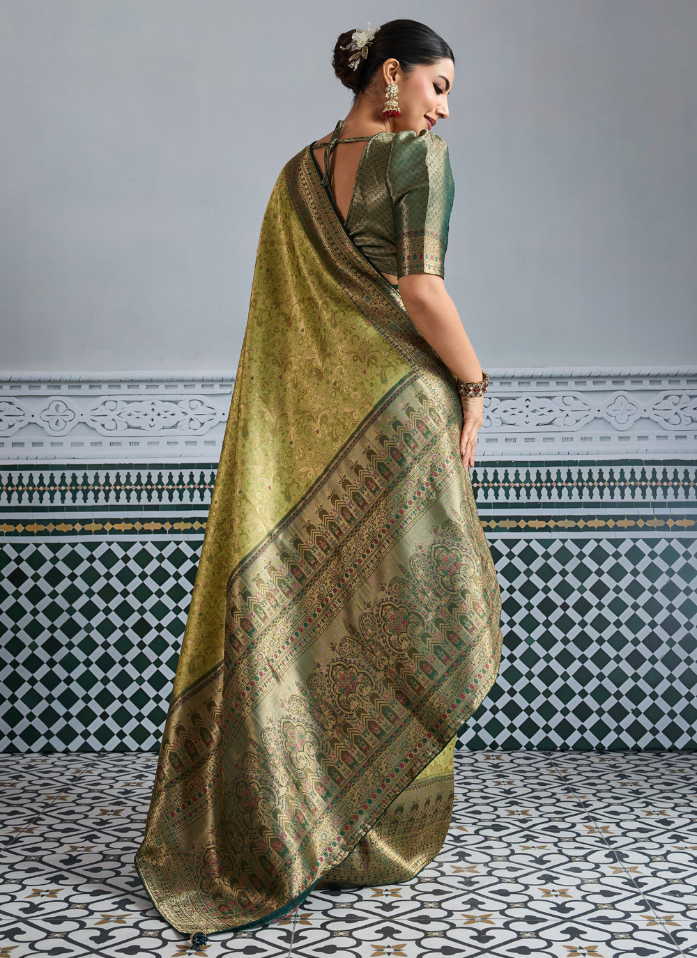 Celebrate timeless tradition with a modern flair in this Green Meenakari Zari Woven Kanjivaram Saree. Crafted with precision, the saree features resplendent floral and paisley motifs in golden zari, highlighted by multi-hued meenakari accents. Ideal for festive events, weddings and cultural functions. Comes with matching blouse.