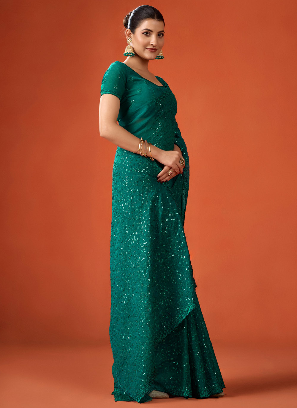 Enhance your ethnic elegance with this Green Moss Sequins Embroidered Classic Saree. The rich moss green shade paired with shimmering sequins embroidery creates a graceful and timeless look. Comes with matching blouse.