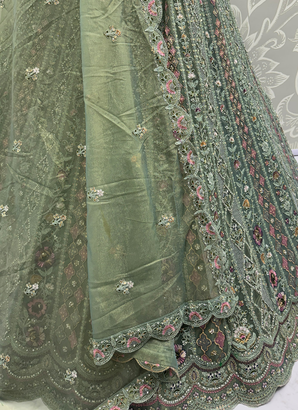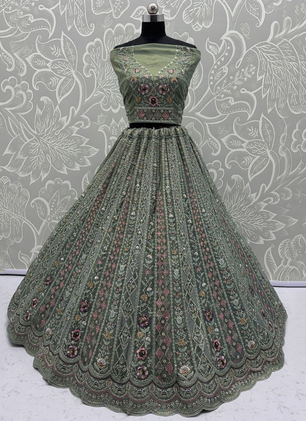 Crafted for special celebrations, this green lehenga choli features intricate embroidery highlighted with shimmering zarkan diamond and sequins work. Its elegant colour and designer finish make it ideal for engagement functions. Comes with matching choli and dupatta.