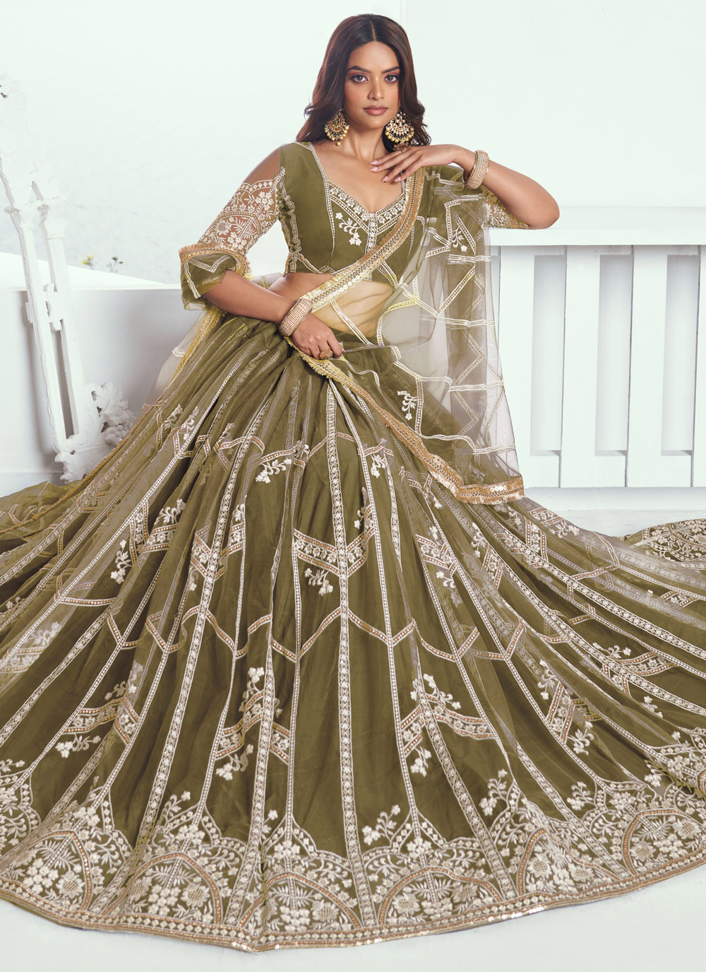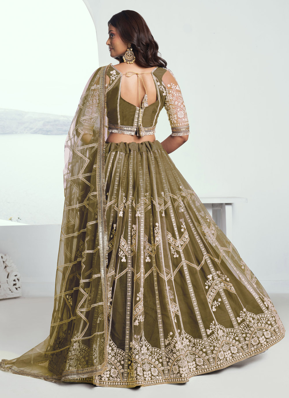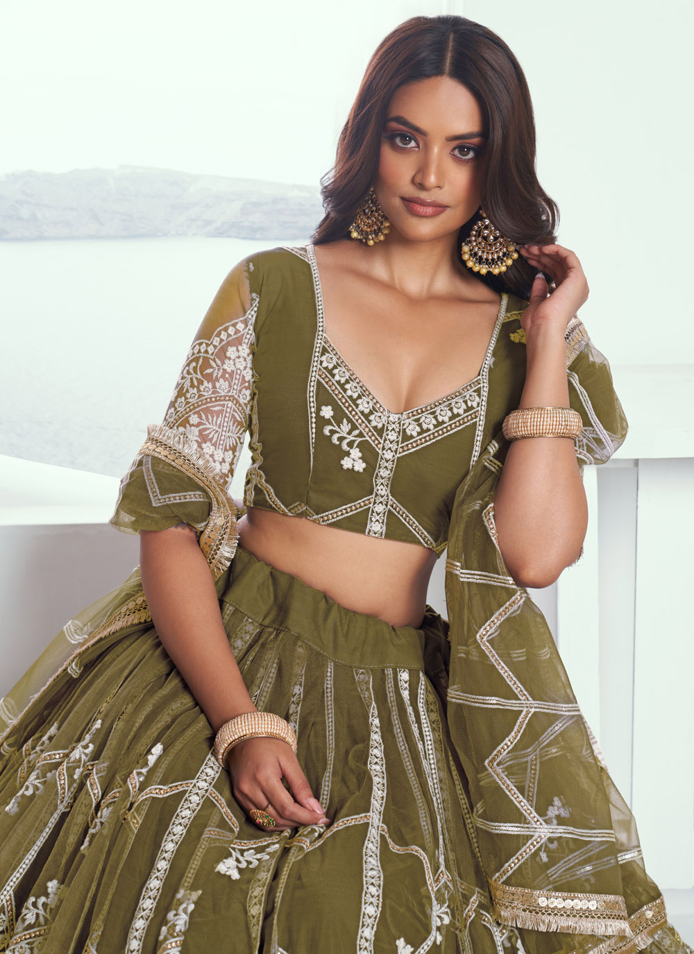 Step into grace with this Green Net A-Line Lehenga Choli, featuring intricate sequins, zari, thread embroidery, and lace detailing. The A-line cut offers a flattering silhouette, while the beautiful green color adds vibrancy to any festive occasion, wedding, or reception. Comes with matching choli and dupatta.