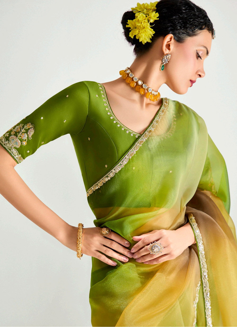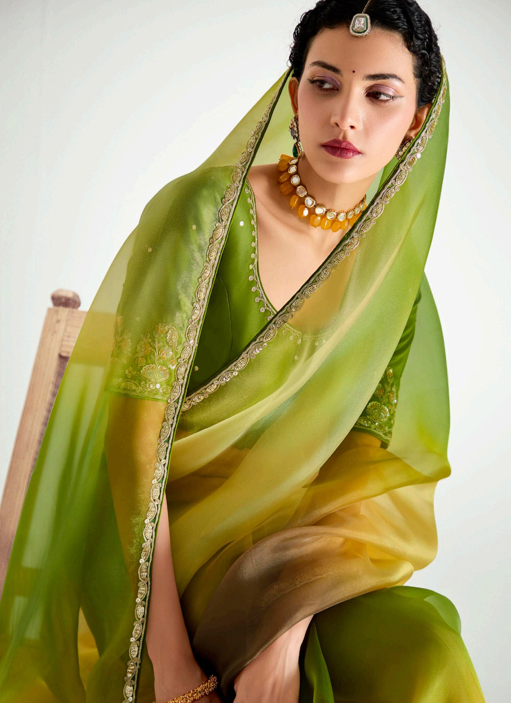 This ceremonial green saree in organza tissue fabric is highlighted by intricate zari border embroidery that elevates its luxurious appeal. The airy drape and rich tone create a graceful ensemble ideal for receptions, sangeet and cultural festivities. Comes with matching blouse.