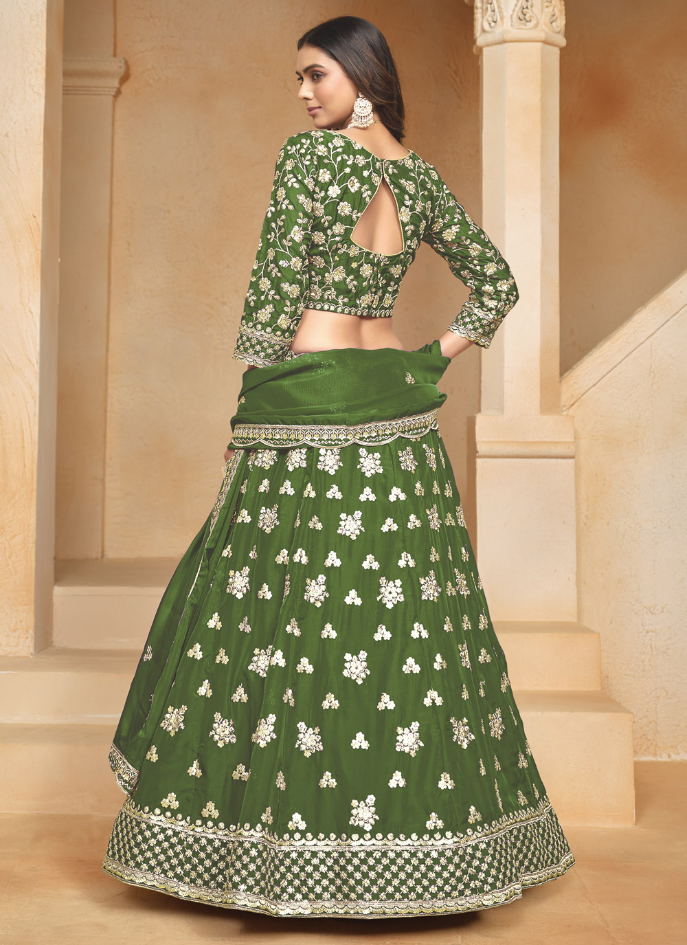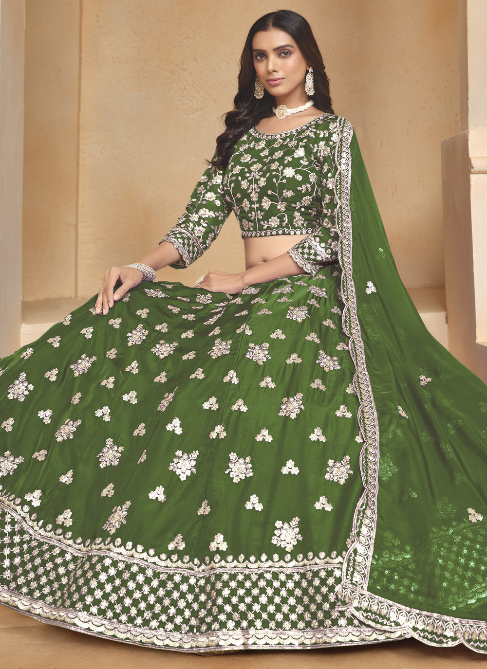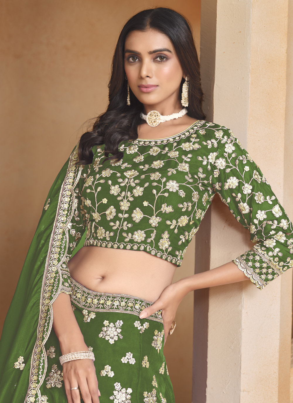 Celebrate your Mehandi ceremony with a touch of modern flair in this green organza lehenga choli. Adorned with shimmering sequins embroidery, this outfit beautifully balances traditional vibes with contemporary elegance. Comes with matching choli and dupatta.