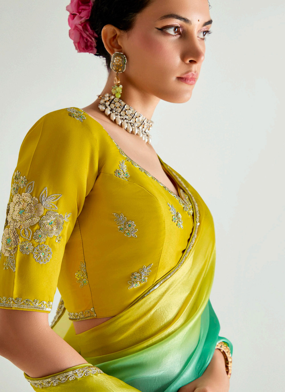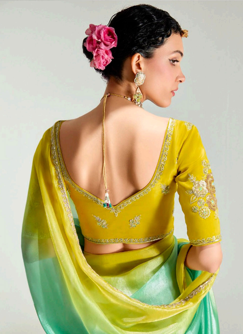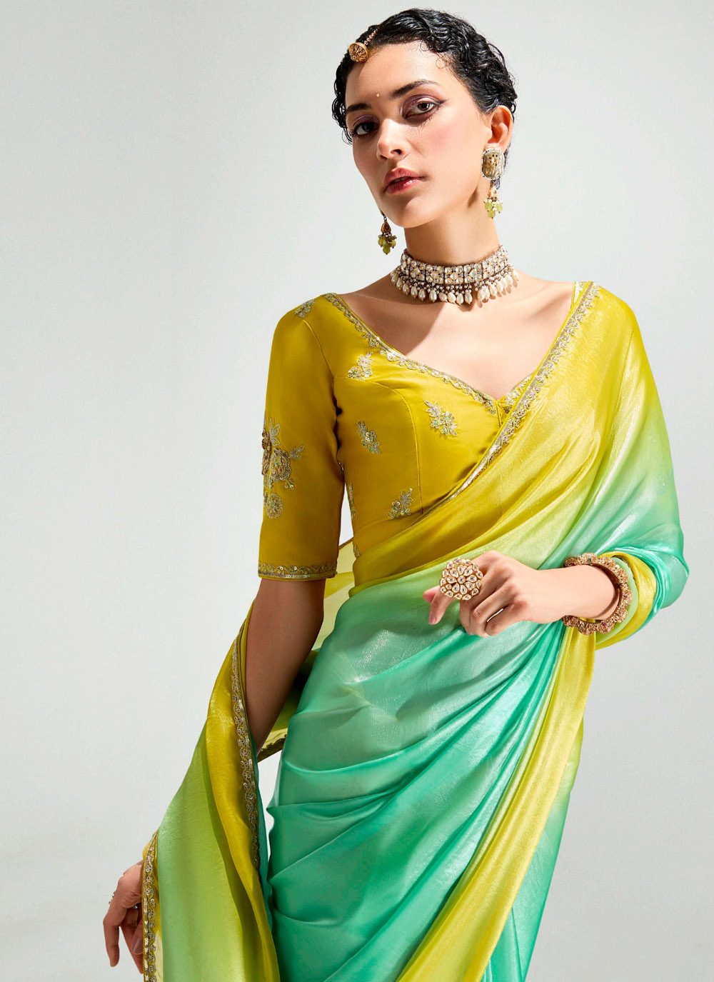 Crafted in premium organza tissue fabric, this green shaded saree features shimmering zari work along the borders for a touch of sophistication. The lightweight feel and graceful shading make it a stunning choice for receptions, sangeet nights and day functions. Comes with matching blouse.