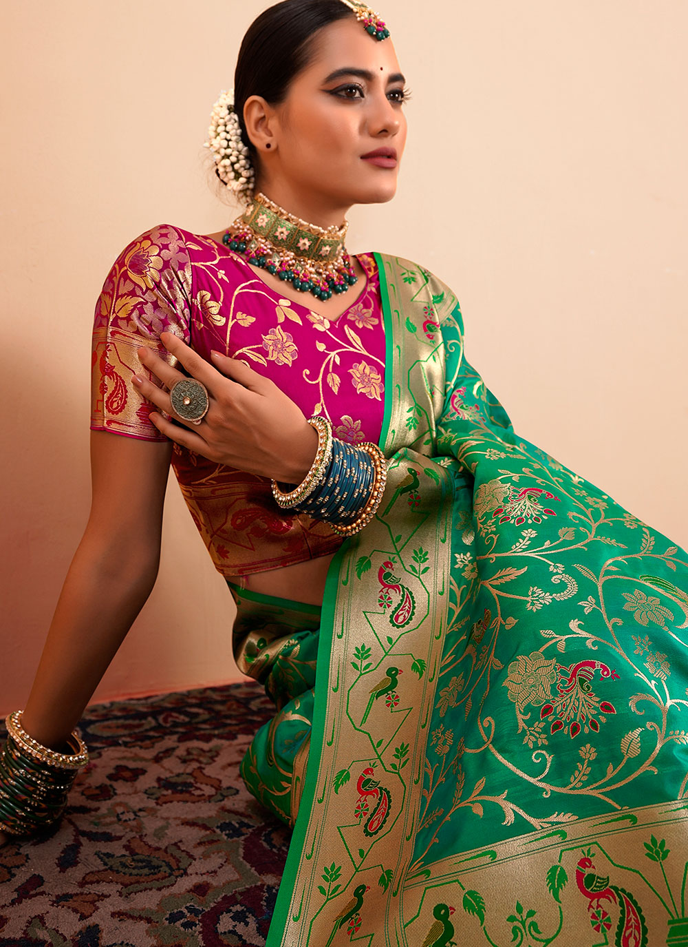 Celebrate in style with the Green Paithani Silk Border Weaving Zari Saree. Featuring an intricate zari border and luxurious Paithani silk, this saree is perfect for weddings. It comes with a matching blouse, creating a stunning traditional look for your special day.