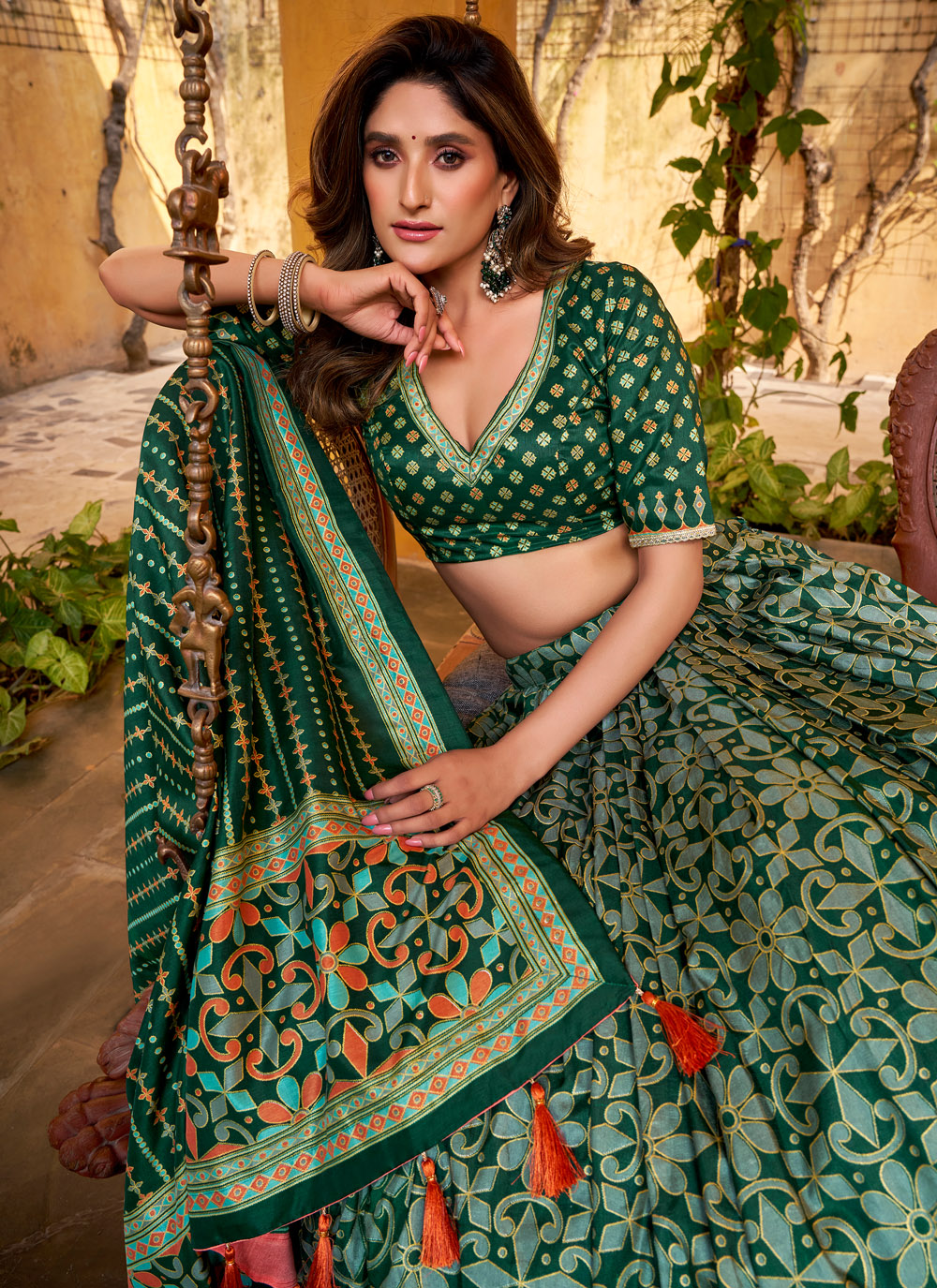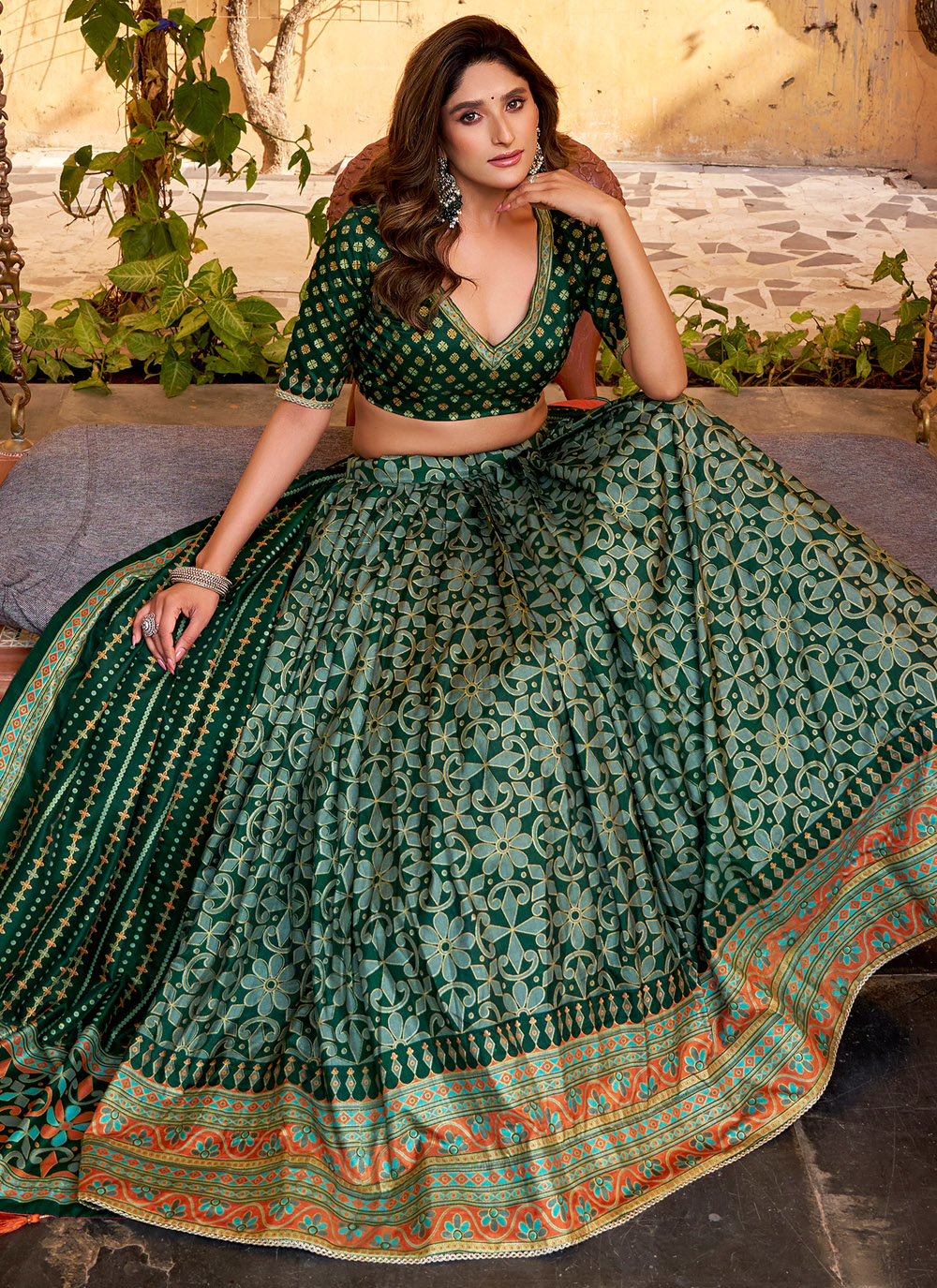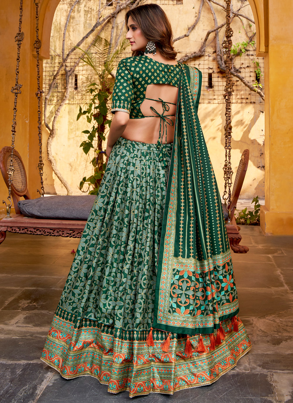 This green printed Tussar silk lehenga choli showcases elegant patterns that enhance its ceremonial appeal. The natural texture of Tussar silk and its rich drape make it a perfect choice for traditional celebrations. Comes with matching choli and dupatta.