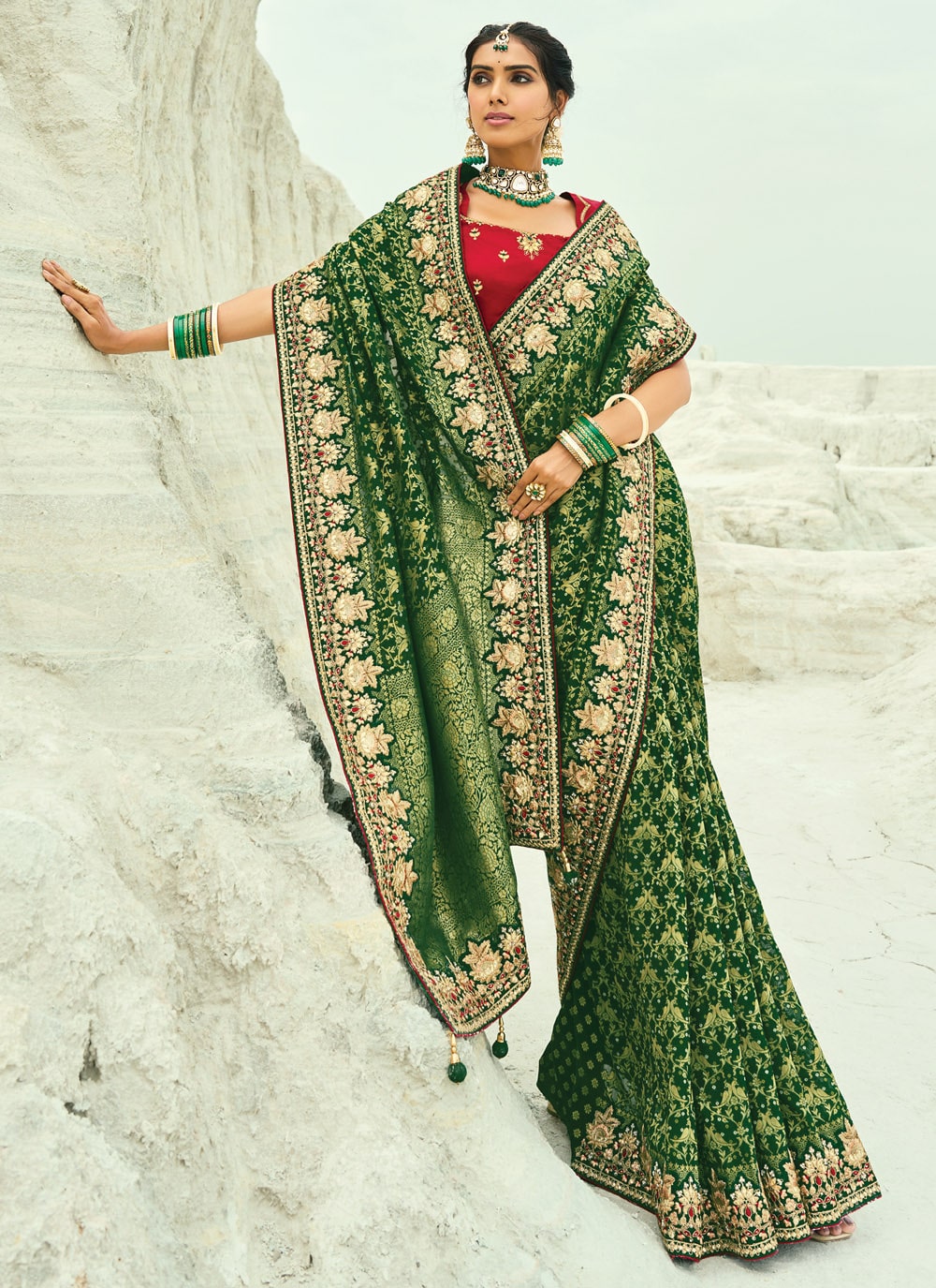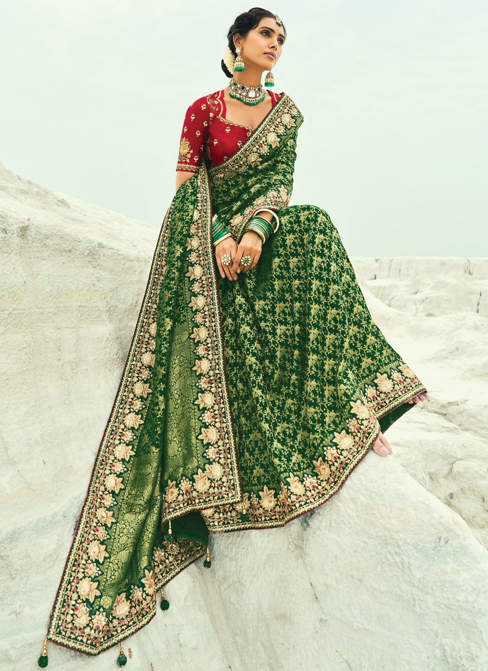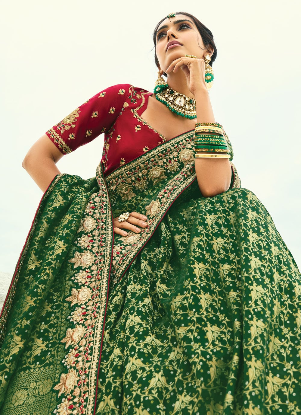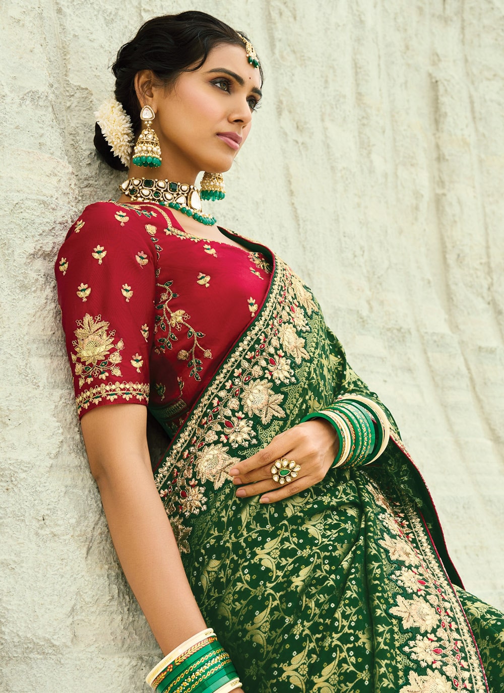 Crafted from premium pure georgette, this Bandhej saree in green highlights India’s rich textile heritage. Zari embroidery blends seamlessly with cutdana shimmer, giving it a statement look that enhances ceremonial dressing. Comes with matching blouse.