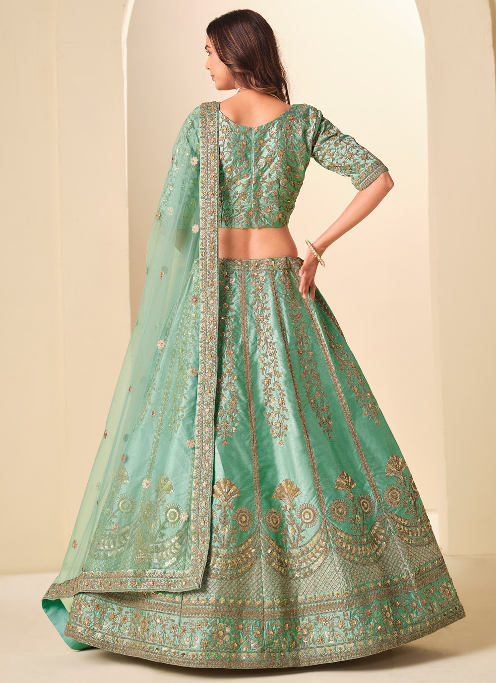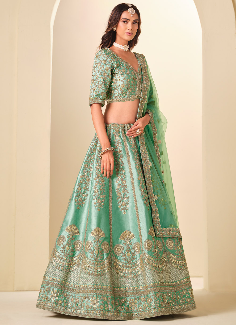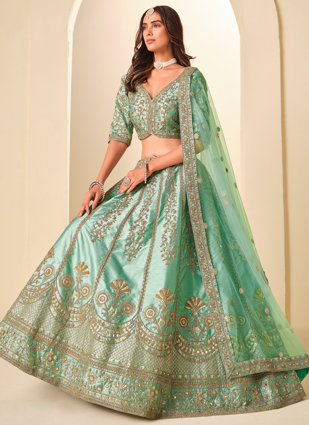 This Green Art Silk Lehenga Choli is designed for women who love trendy ethnic fashion. The intricate resham work combined with delicate sequins creates a graceful sparkle, while the smooth fabric ensures comfort and a beautiful drape. Comes with matching choli and dupatta.