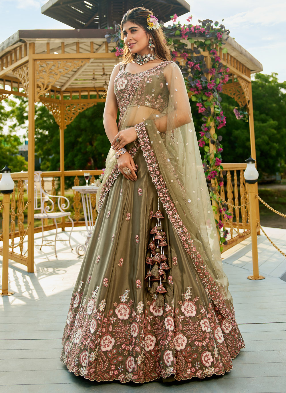 Embrace grandeur in this stunning Green Satin Lehenga Choli, intricately detailed with zari embroidery and sparkling sequins. The ceremonial appeal of this ensemble is perfect for those who want to blend traditional charm with modern allure. Comes with matching choli and dupatta.