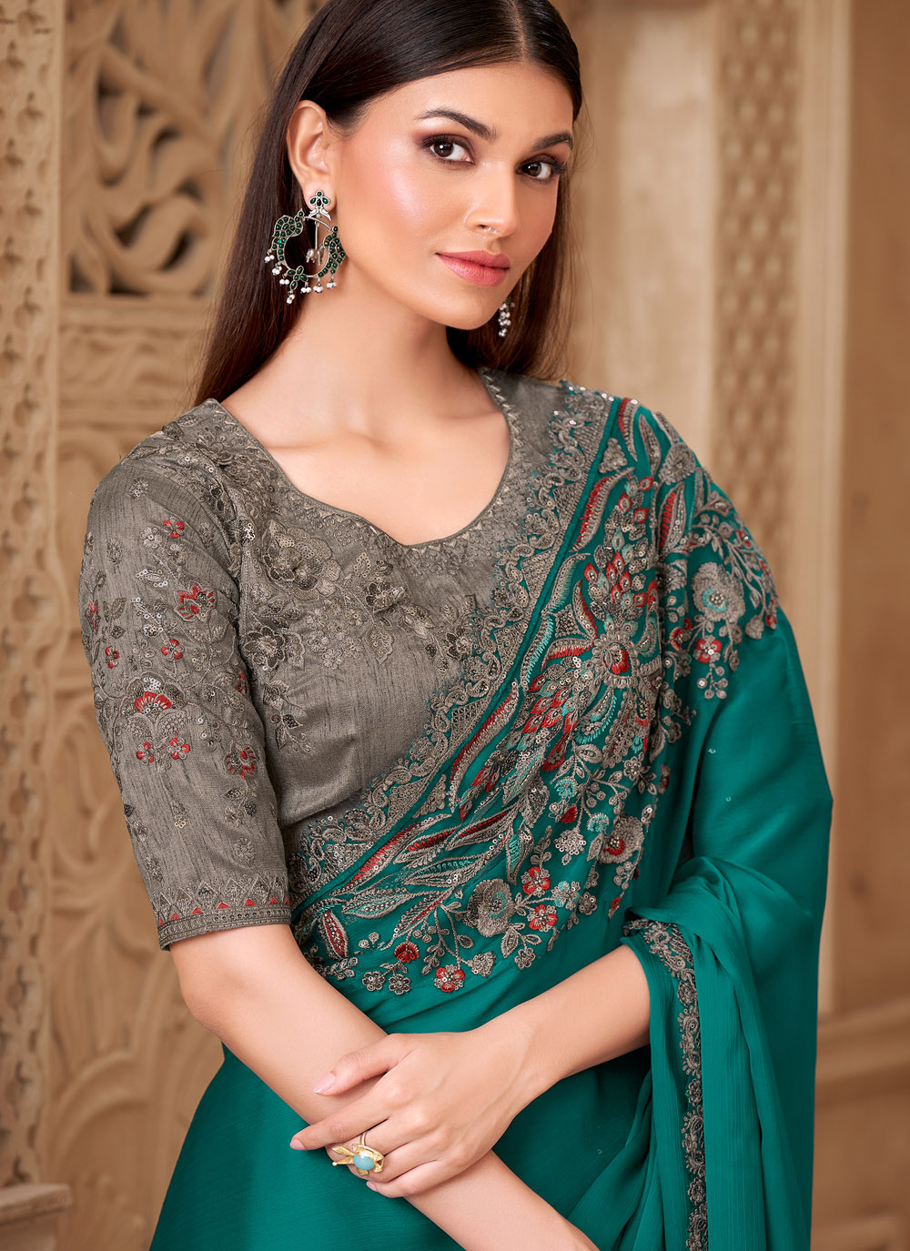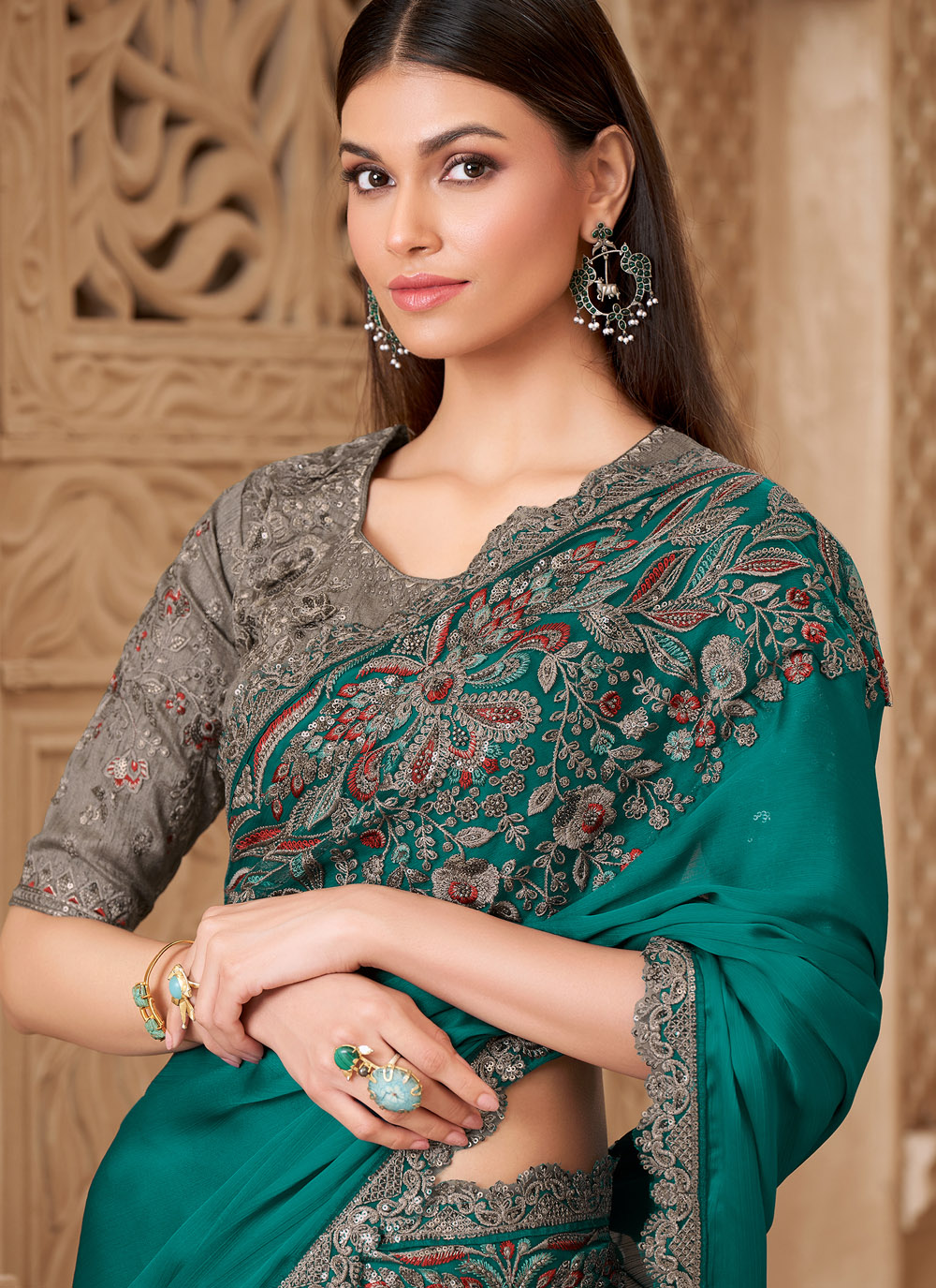 This green satin silk saree features beautifully embroidered borders that enhance its graceful look. The subtle detailing and rich silk sheen give it a traditional look. Comes with matching blouse.