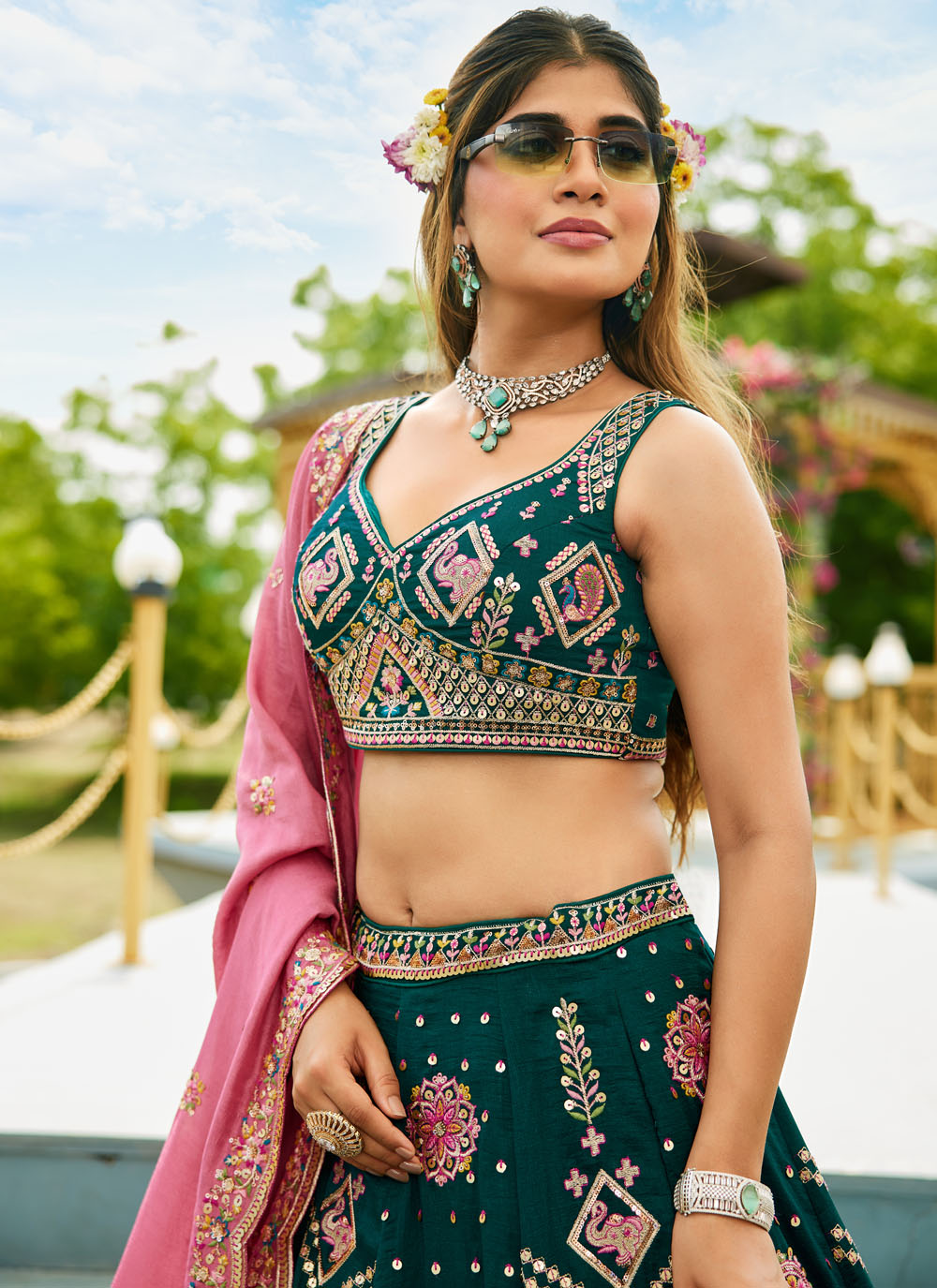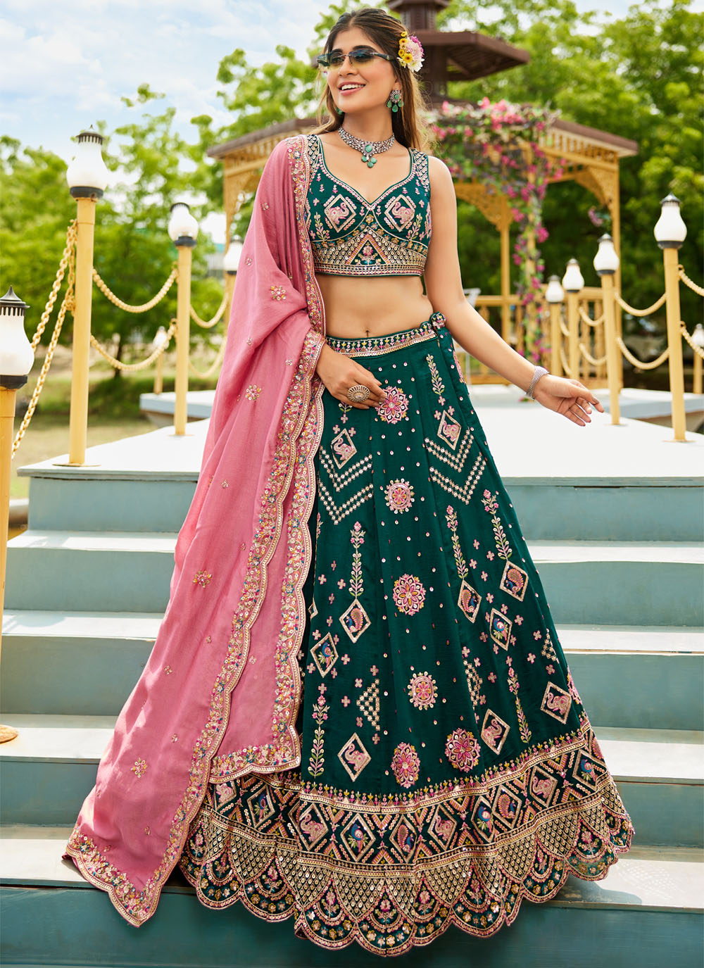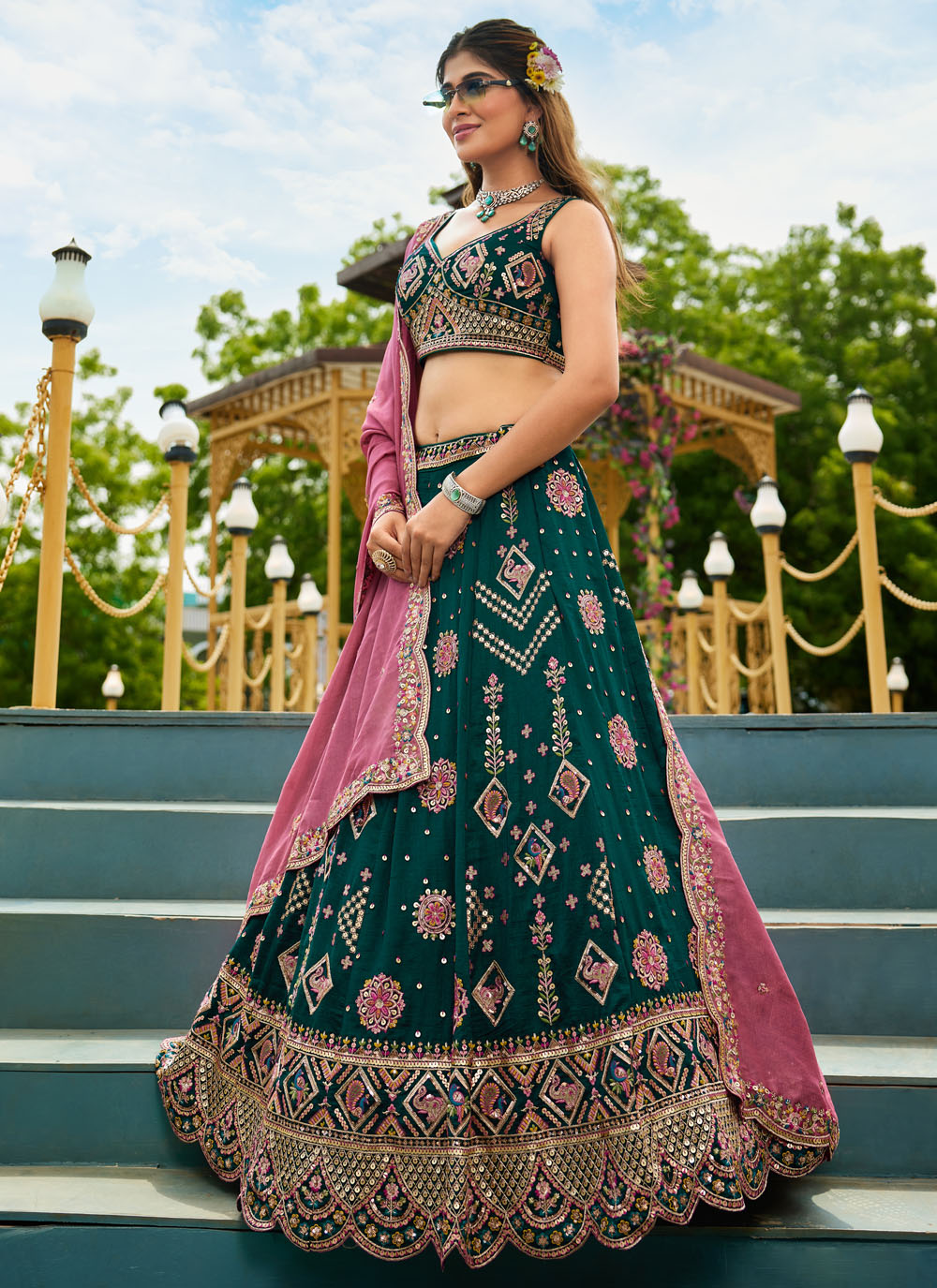 Make a timeless style statement in this stunning green A-line lehenga choli crafted from flowing georgette. Embellished with intricate zari, sequin, and thread embroidery, it blends festive charm with modern elegance. Comes with matching choli and dupatta.