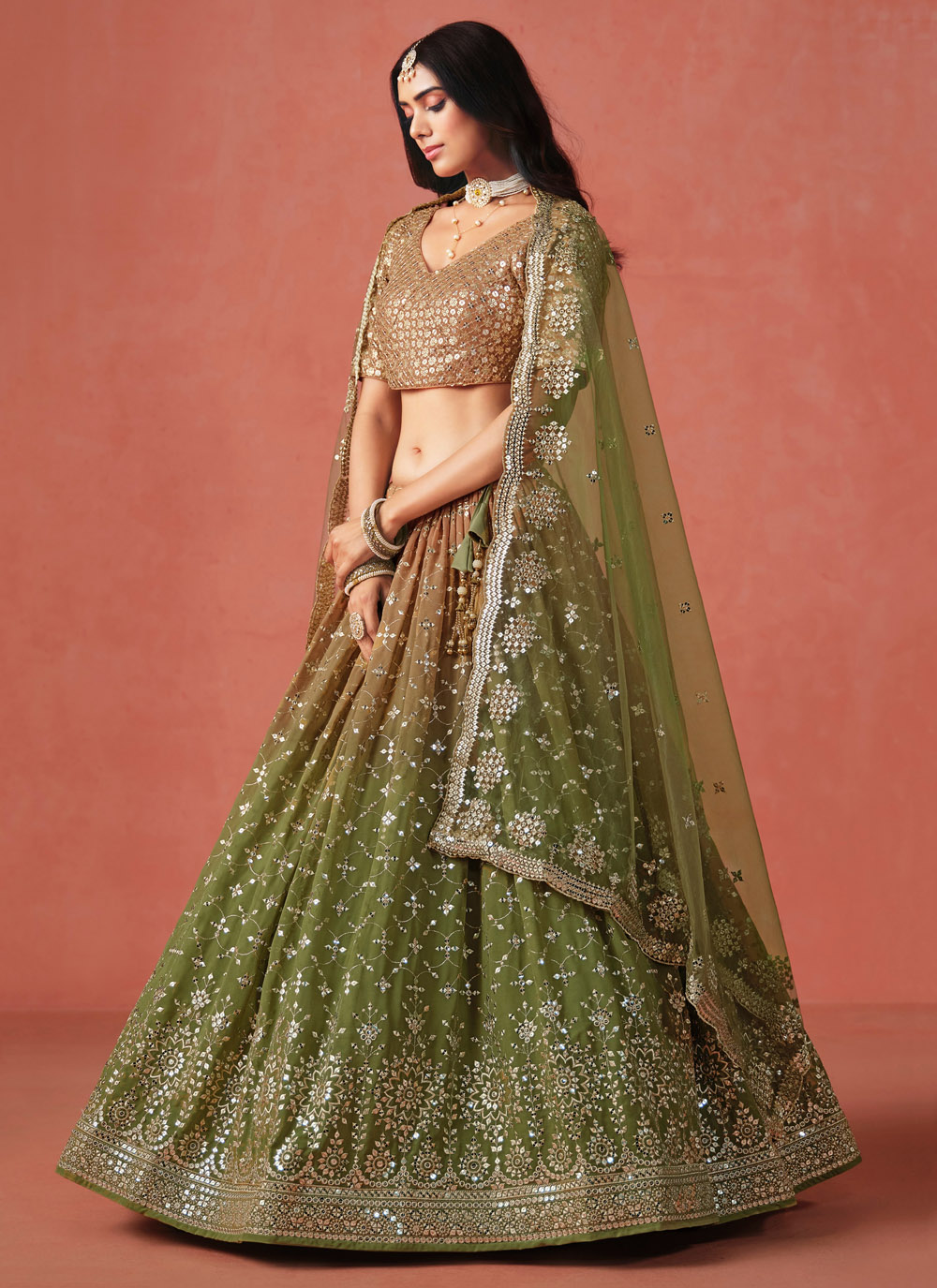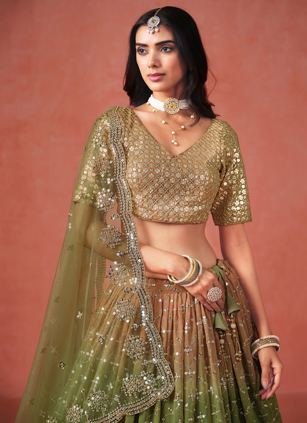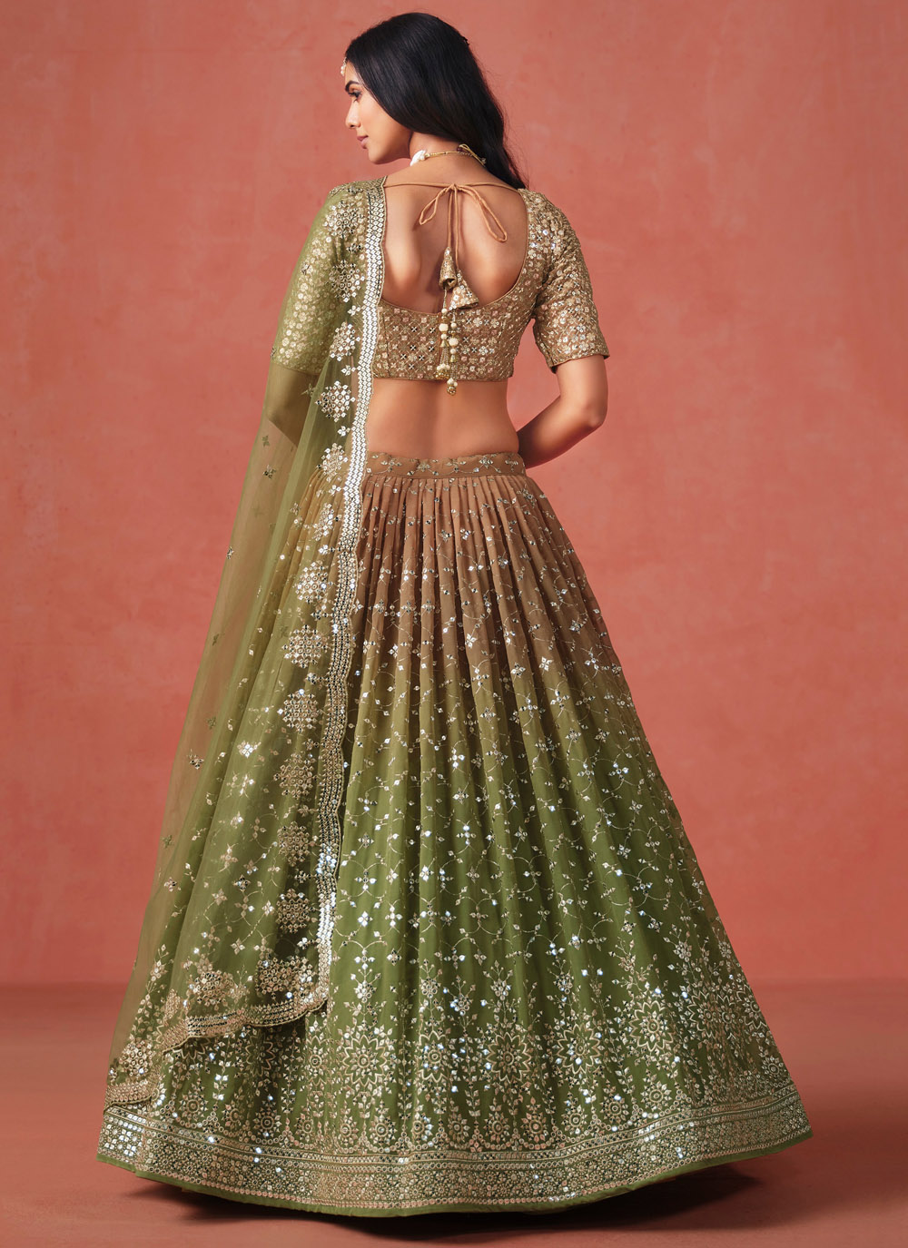 Drape yourself in elegance with this green georgette lehenga choli, featuring shimmering sequins and intricate zari work. Its rich detailing and ceremonial appeal make it perfect for weddings, receptions and grand festive events. A graceful silhouette that blends tradition with contemporary flair. Comes with matching choli and dupatta.