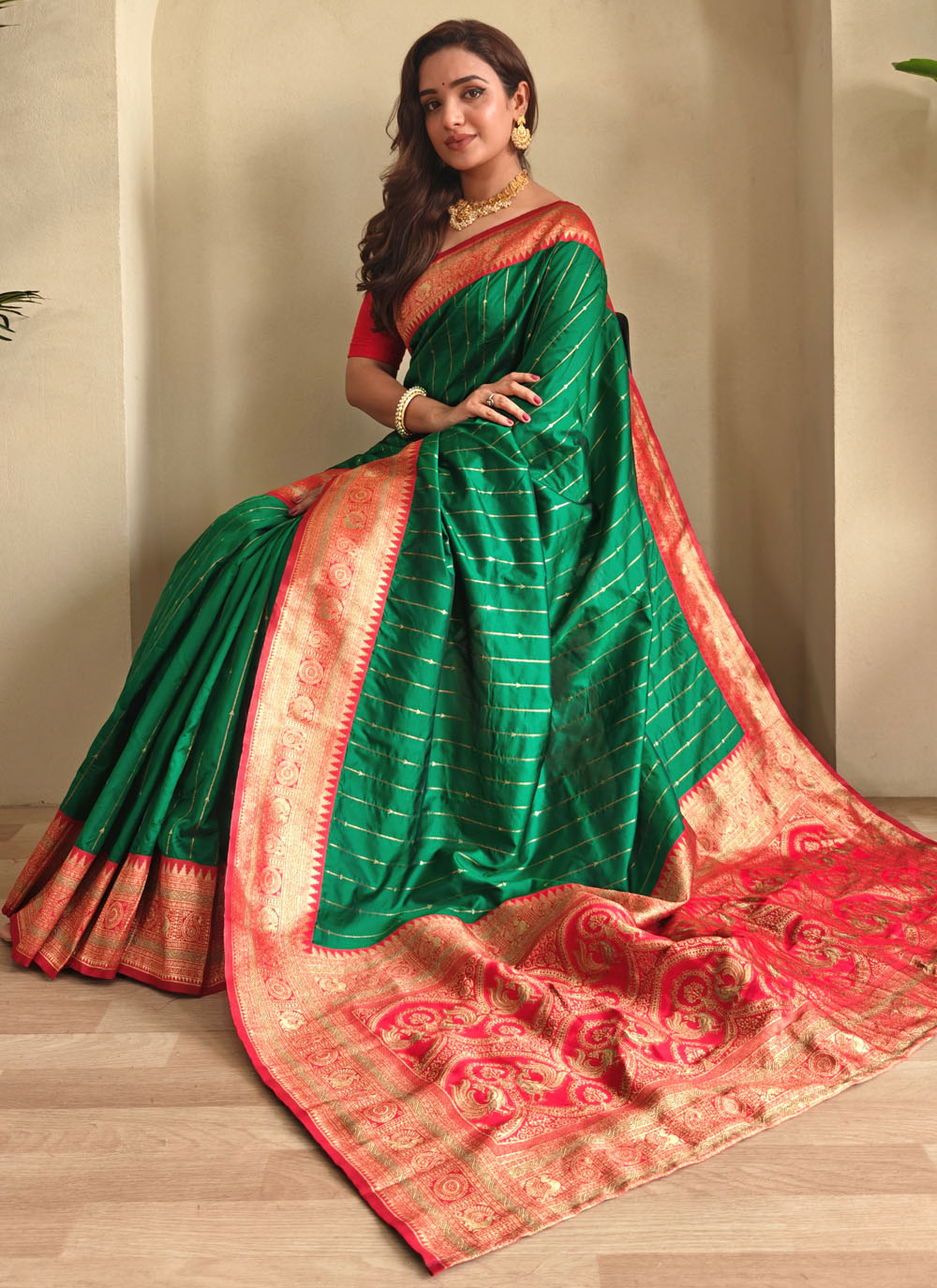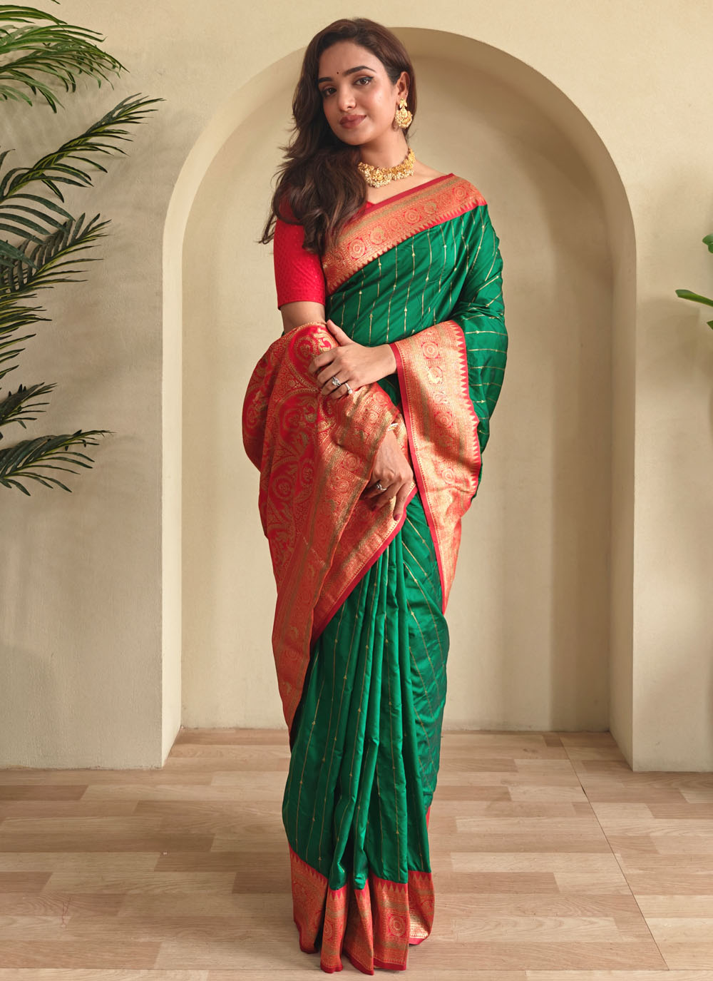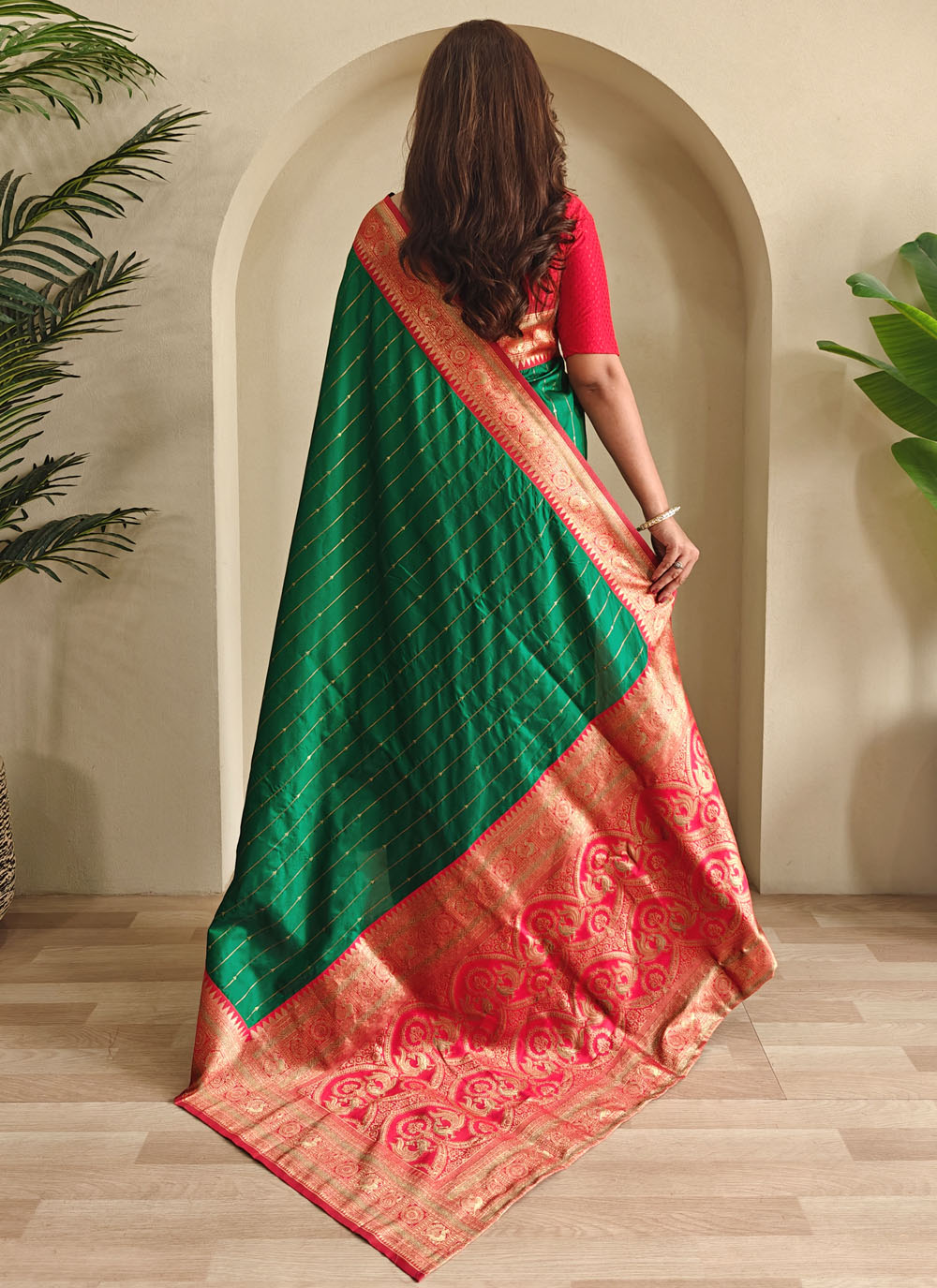 Elevate your ethnic collection with this beautifully woven green silk saree, designed with elegant zari work. Its contemporary silhouette makes it a versatile pick for cultural gatherings, modern festivities and elegant celebrations. Comes with matching blouse.