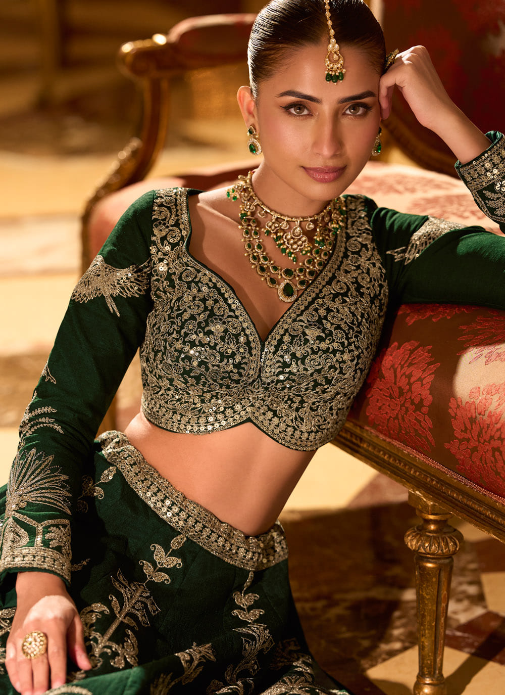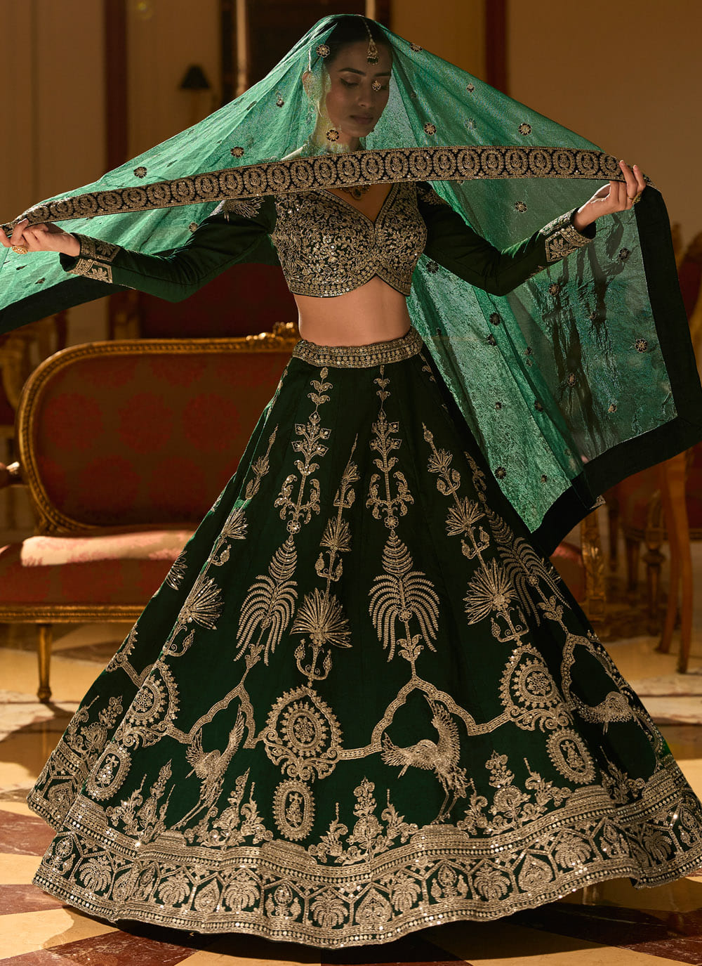 This Green silk readymade lehenga choli is designed to offer instant elegance with rich detailing. Crafted with fine embroidery and shimmering sequins work, it brings a festive glow to your look. Comes with matching choli and dupatta.
