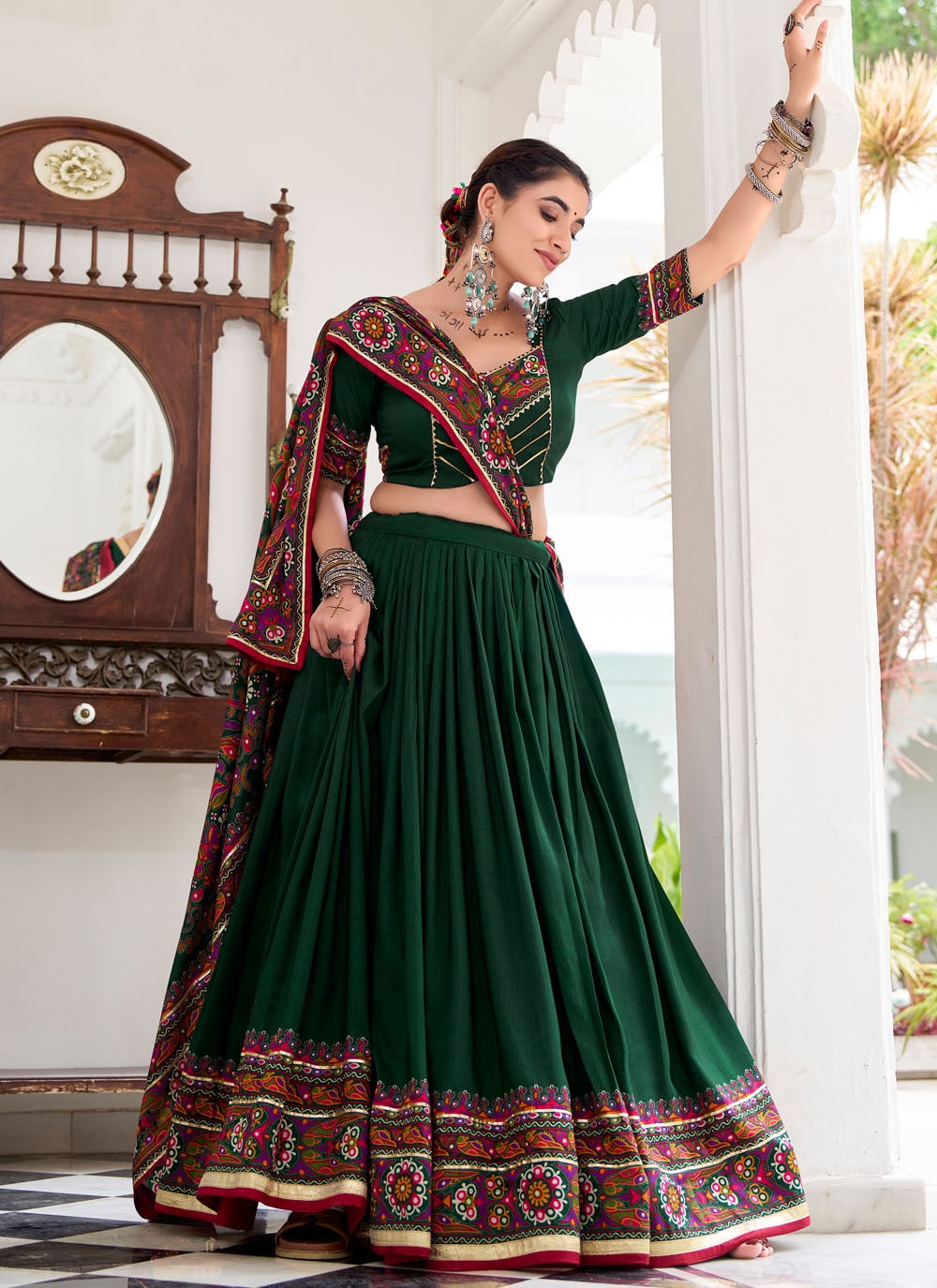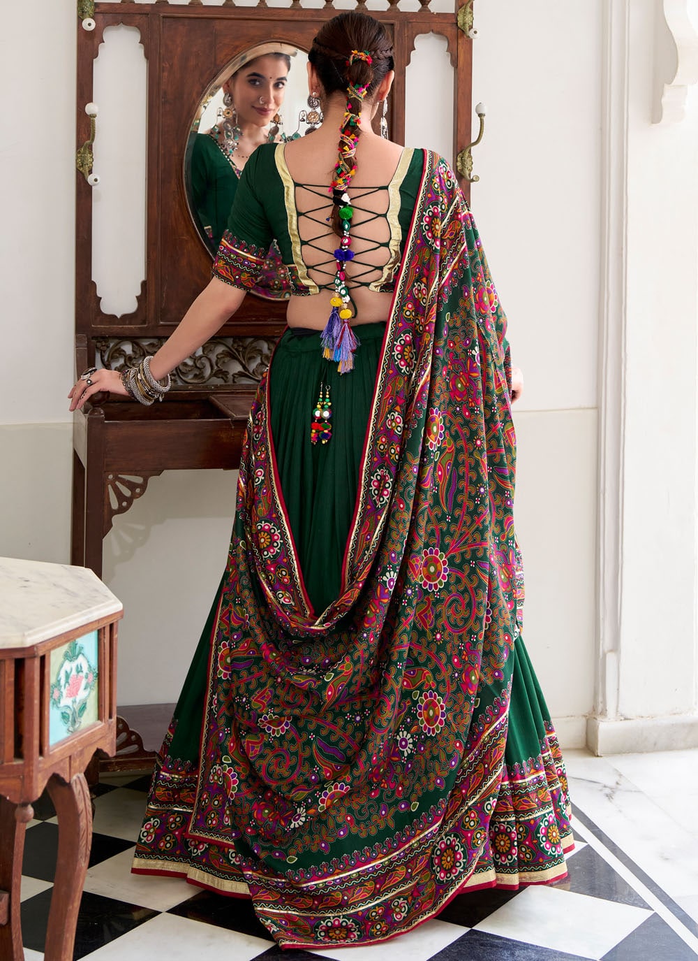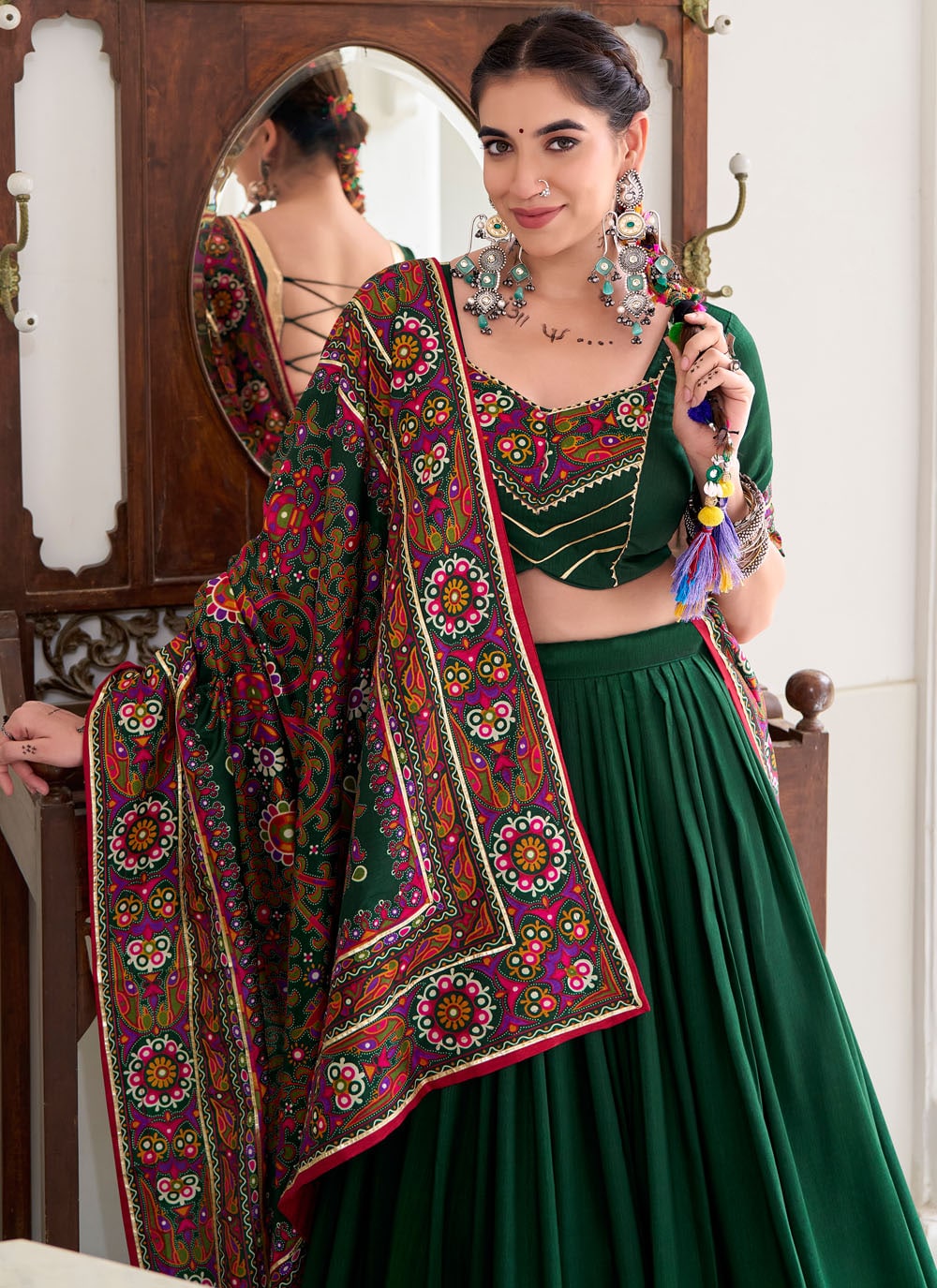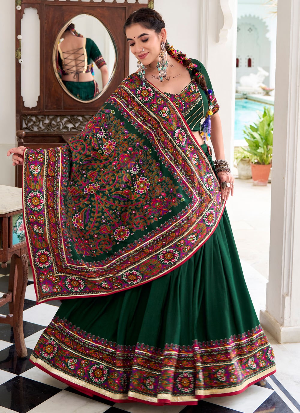 Turn festive occasions into a celebration of style with this Green Silk Readymade Lehenga Choli, highlighted with exquisite Gamthi print work and delicate lace detailing. Designed in a readymade format, it guarantees hassle-free wear and a flattering fit. Comes with matching choli and dupatta.