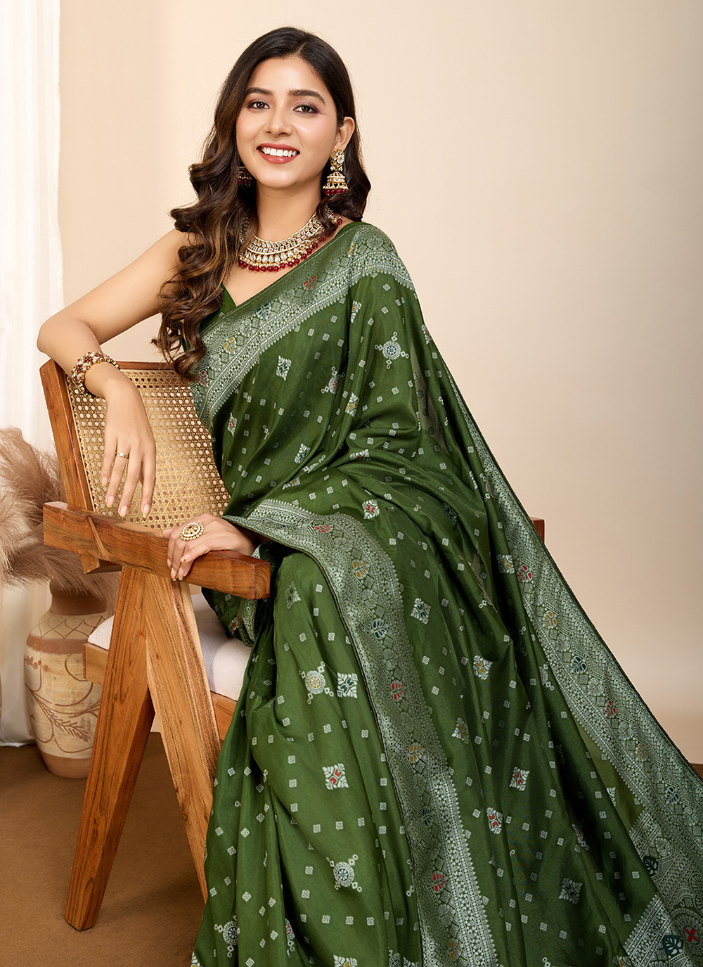 The Green Silk Meenakari Party Wear Saree is a vibrant and elegant choice for any festive occasion. With intricate Meenakari work, it adds a touch of traditional craftsmanship to the rich green silk fabric. Paired with a matching blouse, this saree offers a perfect blend of style and sophistication, making it ideal for parties or special events.