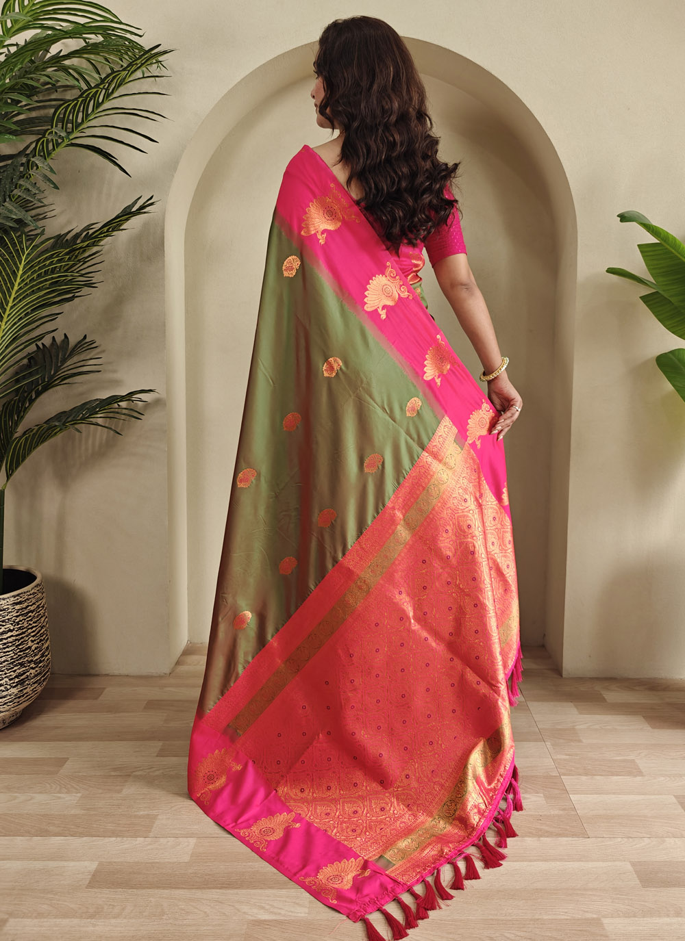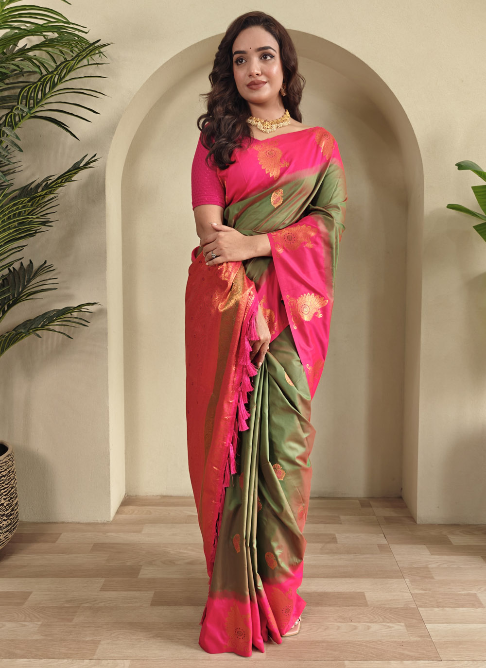 Embrace festive vibes with this elegant green silk saree adorned with exquisite woven detailing. A perfect blend of tradition and trend, ideal for festivals and special gatherings. Its rich texture and vibrant hue make every celebration memorable. Comes with matching blouse.