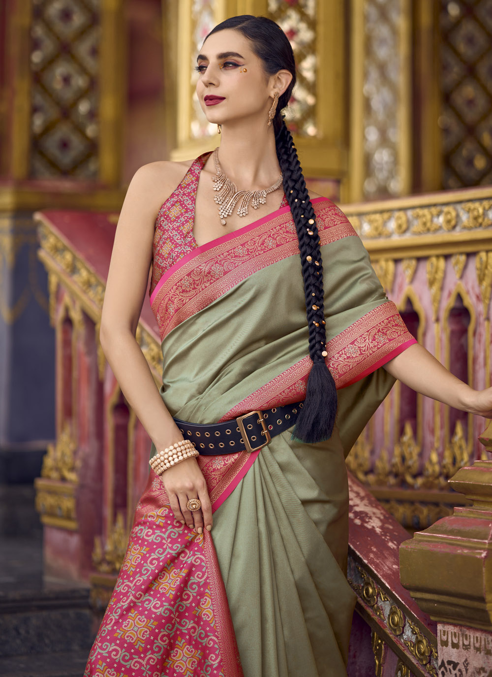 A statement piece for the traditional woman, this green woven silk saree combines age-old weaving techniques with a fresh, vibrant color. Style it with antique jewelry for a complete festive look. Comes with matching blouse.