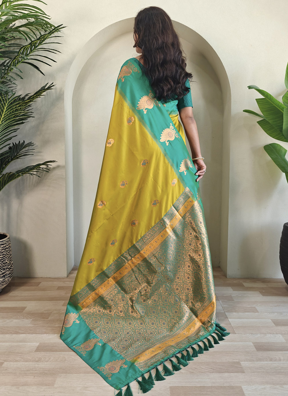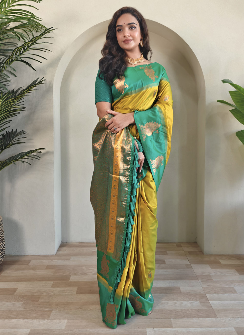 This Green Silk Saree is a testament to timeless Zari weaving artistry, embodying a sacred aura. Its exquisite patterns and lustrous silk make it ideal for rituals and formal ceremonies. Experience the blend of cultural heritage and refined elegance. Comes with matching blouse.