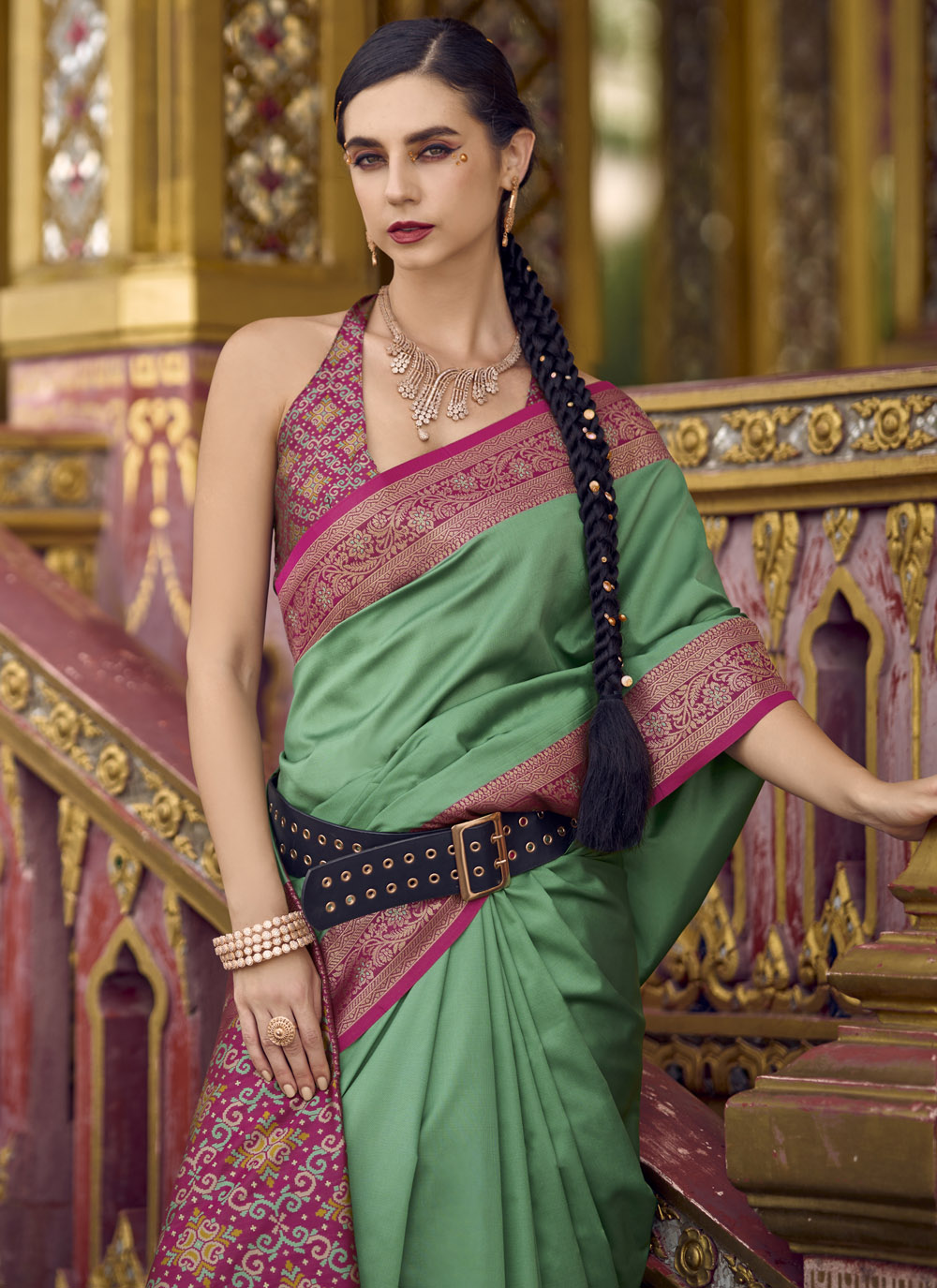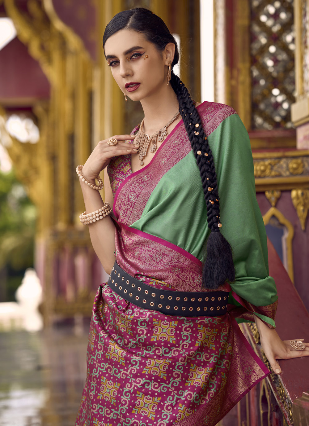 Drape yourself in elegance with this rich green silk saree adorned in intricate zari weaving work. Designed especially for ceremonial occasions, its timeless charm and regal aura make it a classic addition to your ethnic wardrobe. Comes with matching blouse.