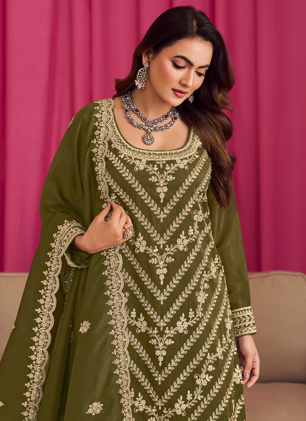 This green thread embroidered palazzo set blends traditional craftsmanship with modern style. The intricate embroidery enhances its charm, while the comfortable palazzo pants add a contemporary twist to your festive look. Comes with matching bottom and dupatta.