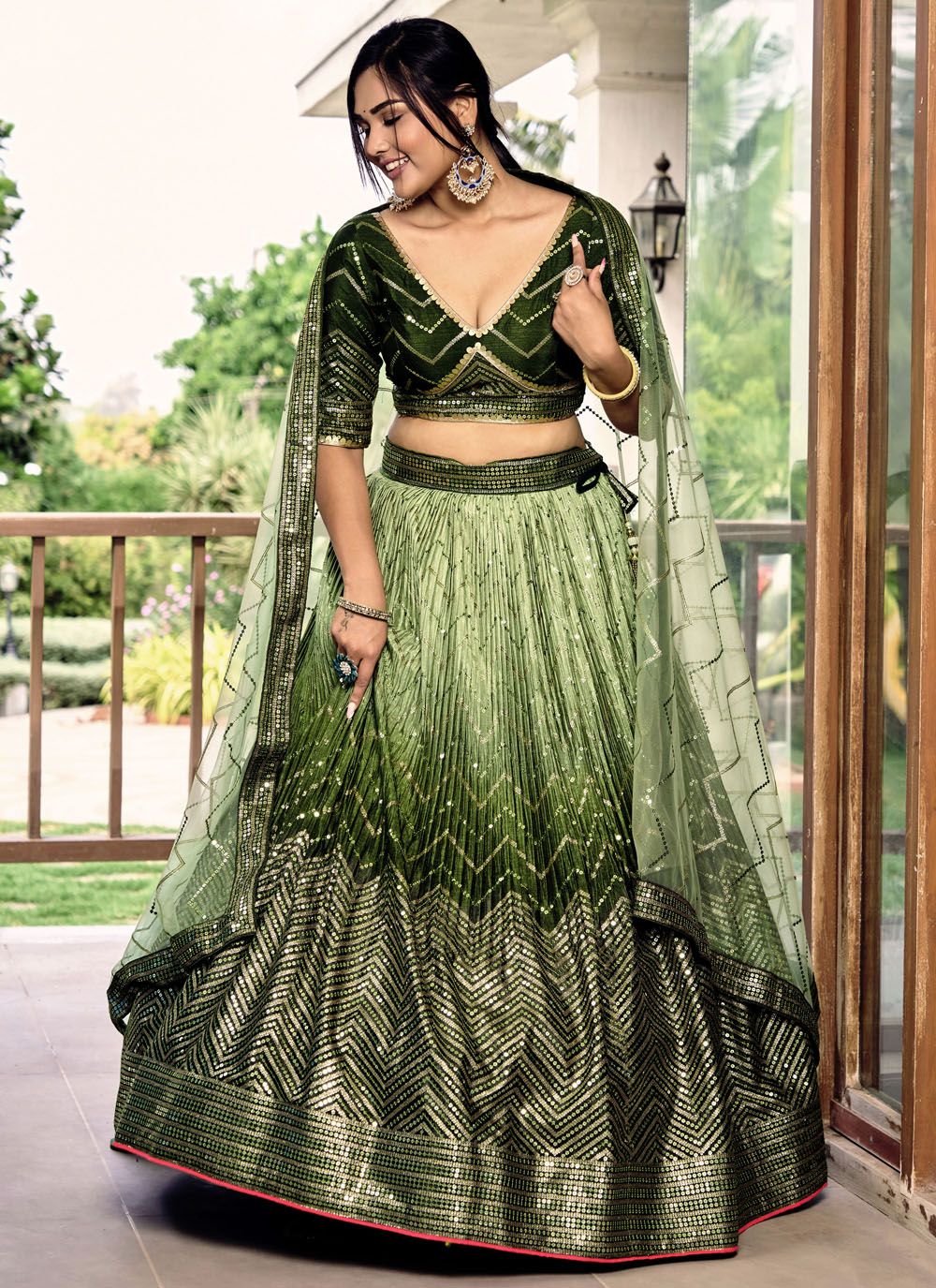 Add timeless beauty to your ethnic wardrobe with this green sequins embroidered Chinon lehenga choli. The detailed thread work reflects fine craftsmanship, while the graceful design offers a flattering and stylish silhouette. Comes with matching choli and dupatta.