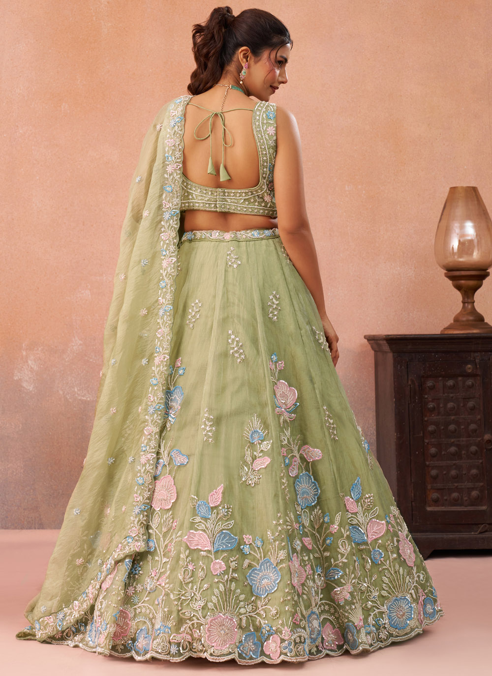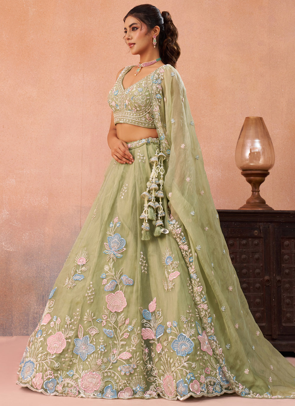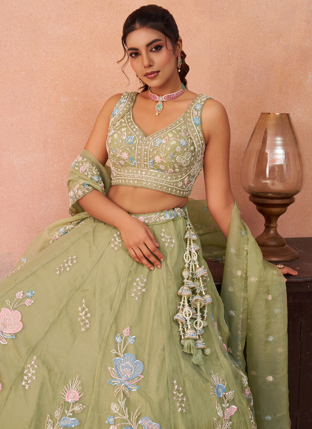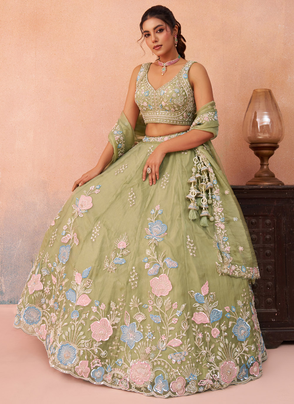 Green Tissue Embroidered Sequins Beads Designer Lehenga Choli brings together elegance and festive glamour in a stunning ethnic ensemble. Crafted with rich tissue fabric, the outfit is beautifully adorned with detailed embroidery, sparkling sequins and delicate bead embellishments. Comes with matching choli and dupatta.