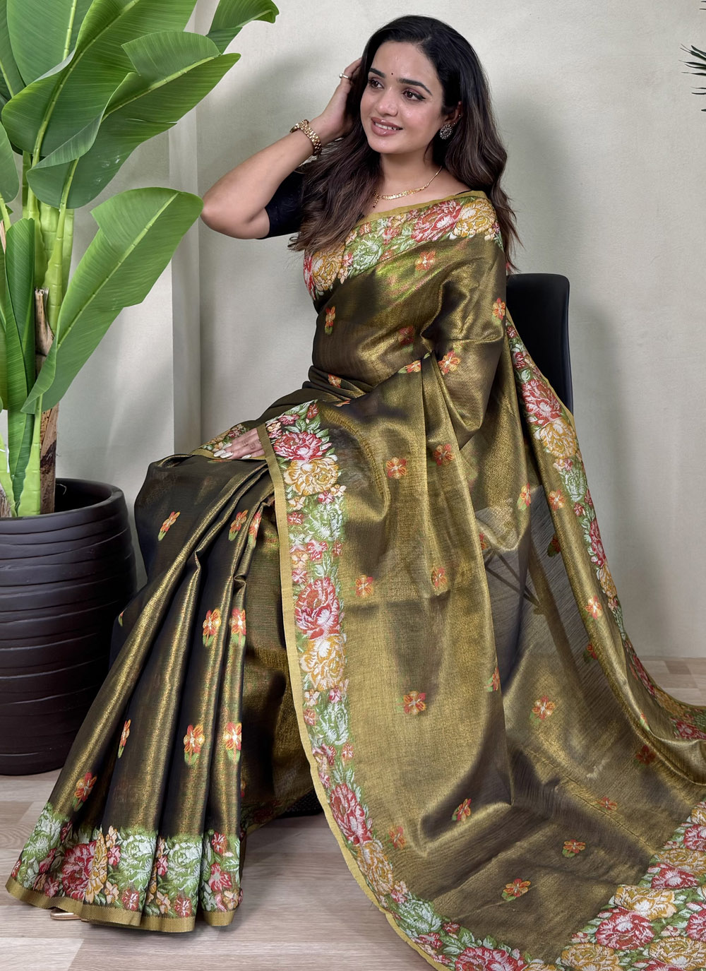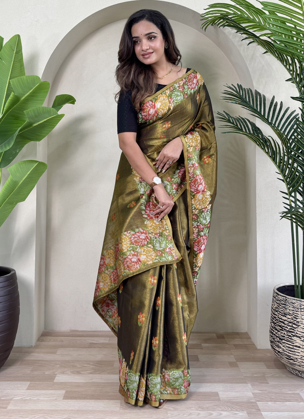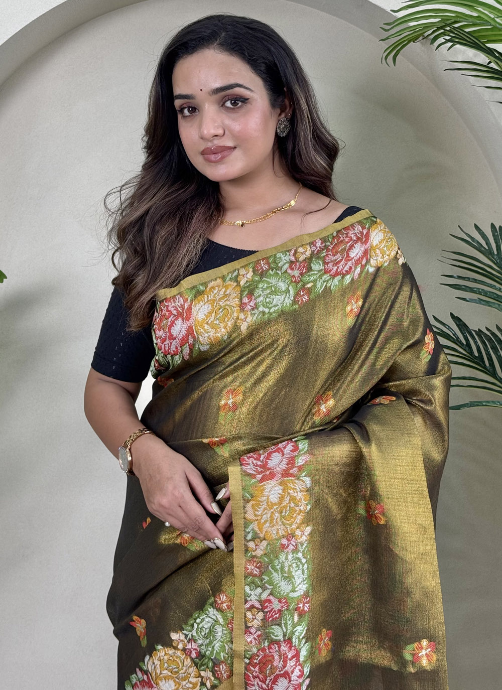This Green Tissue Saree with jacquard weaving is a beautiful fusion of tradition and modern style. The rich green hue and contemporary design elements make it a stylish pick for festive events, formal gatherings, or traditional events. Comes with matching blouse.