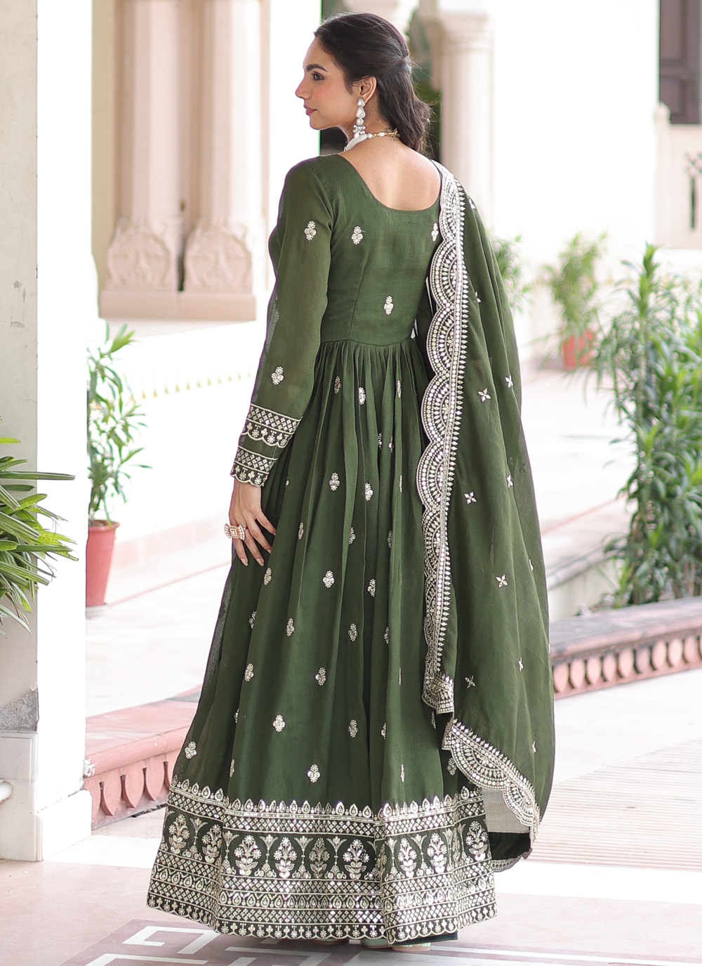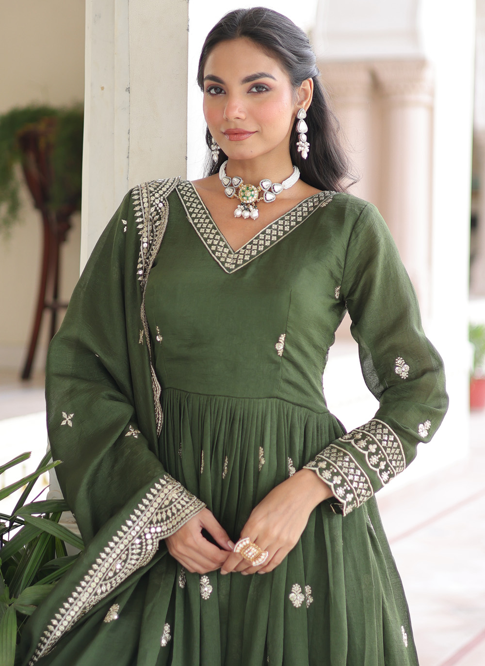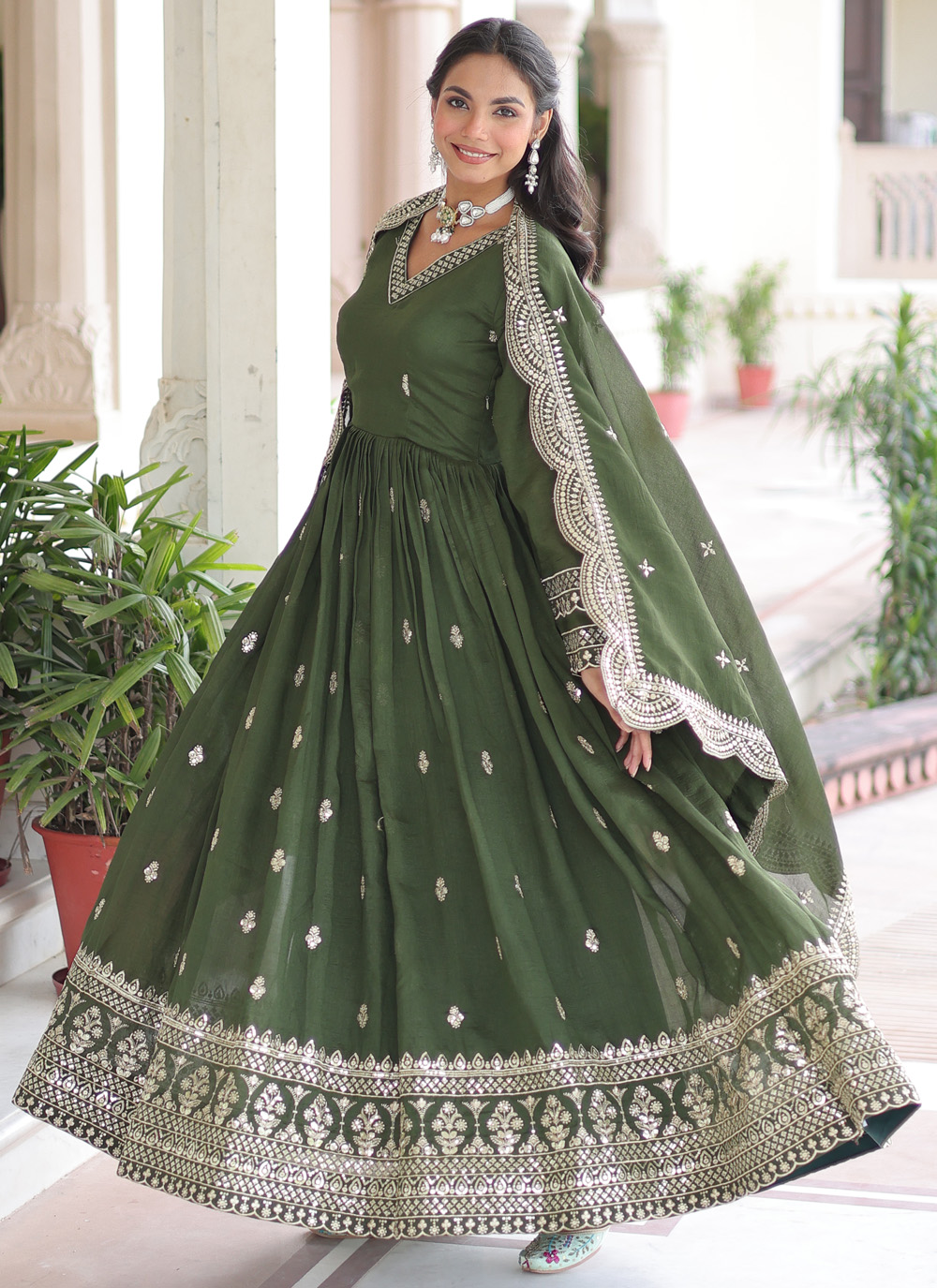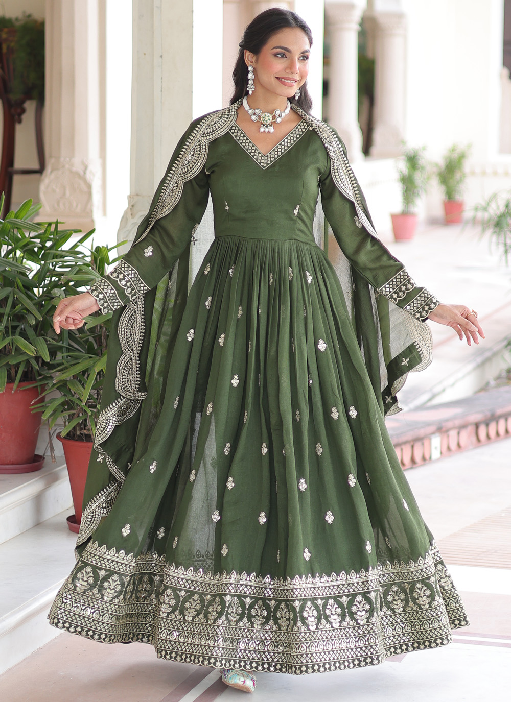 Designed for women who love a blend of style and comfort, this Green Vichitra Silk Zari Sequins Embroidered Gown stands out with its smooth texture and sparkling handcrafted work. Comes with matching dupatta.