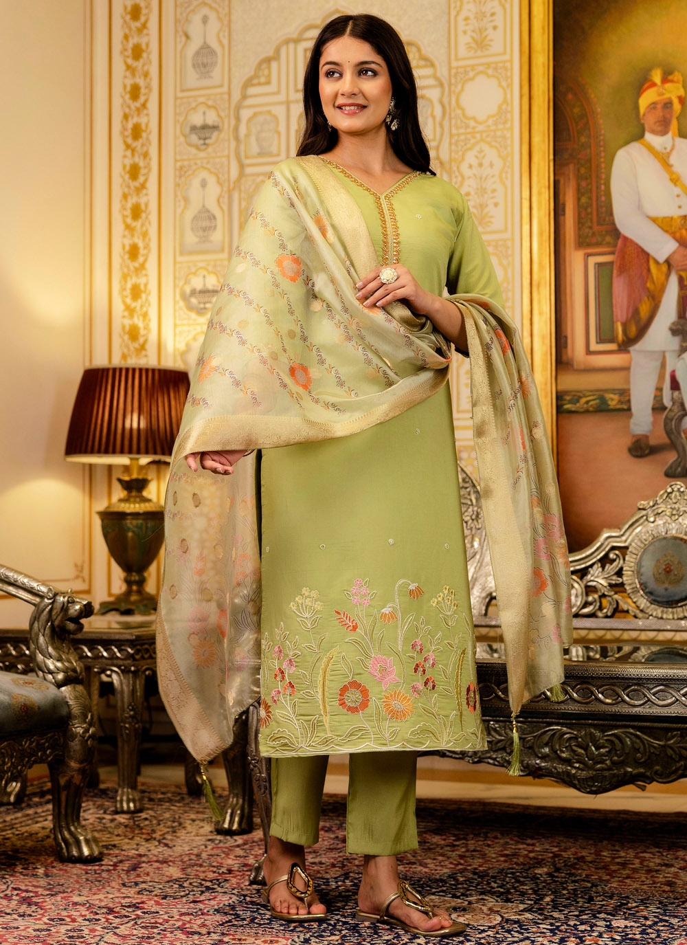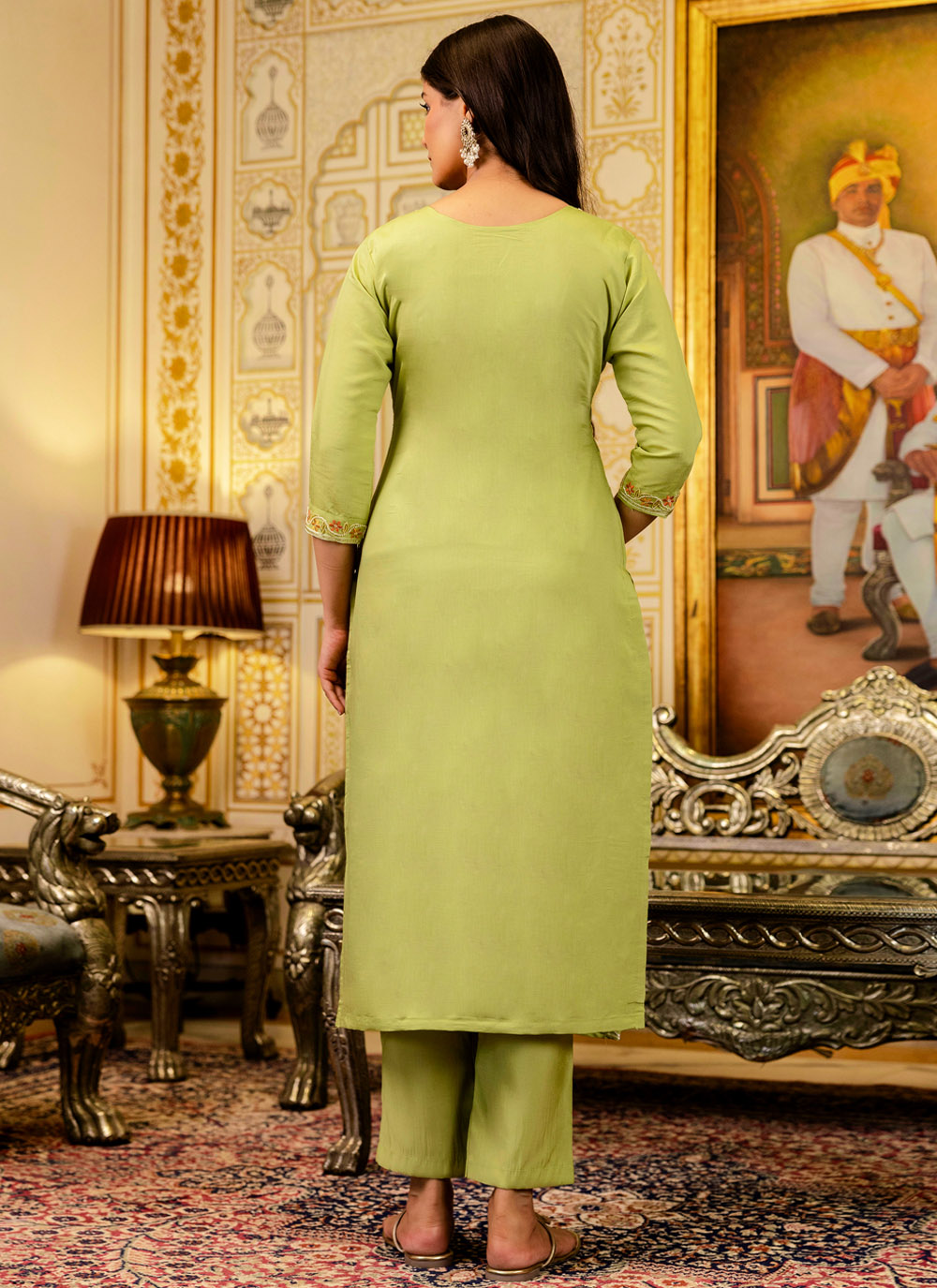 The suit shines with delicately embroidered accents on a rich green viscose base, offering a classy and polished ceremonial appeal. Its breathable fabric and ready-to-wear design ensure comfort throughout the event. Comes with matching bottom and dupatta.