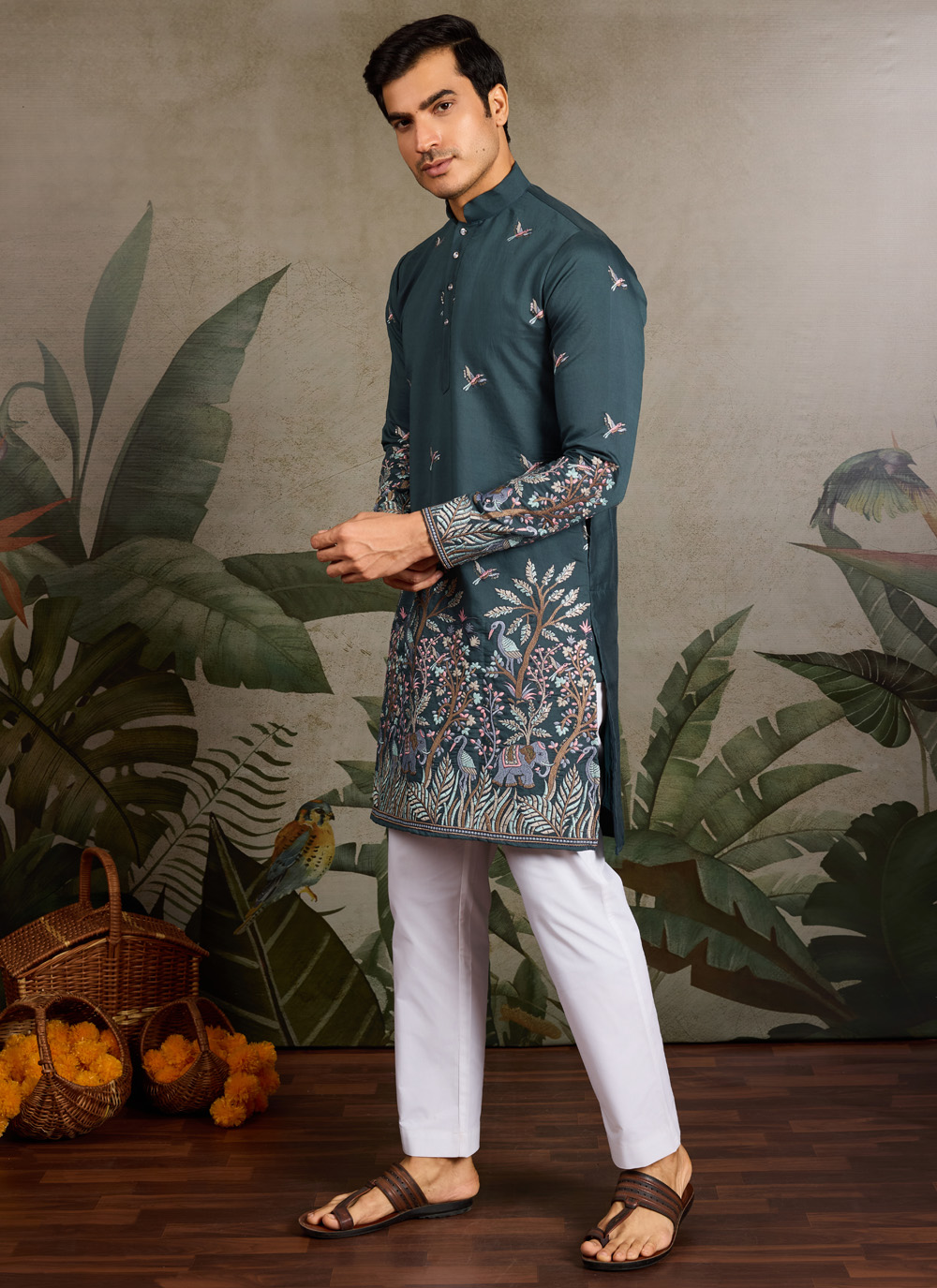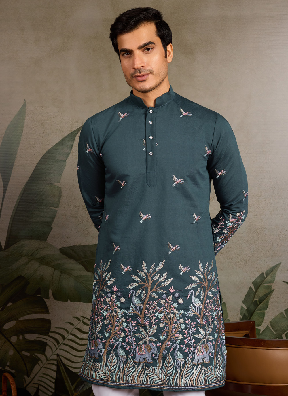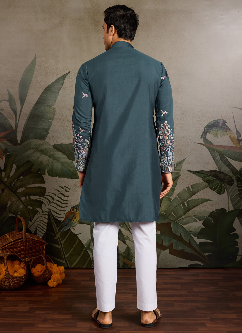 Celebrate in style with this green viscose silk kurta, enhanced with intricate thread embroidery and subtle sequins work. Its rich color and luxurious fabric make it perfect for weddings, festivals or traditional ceremonies.