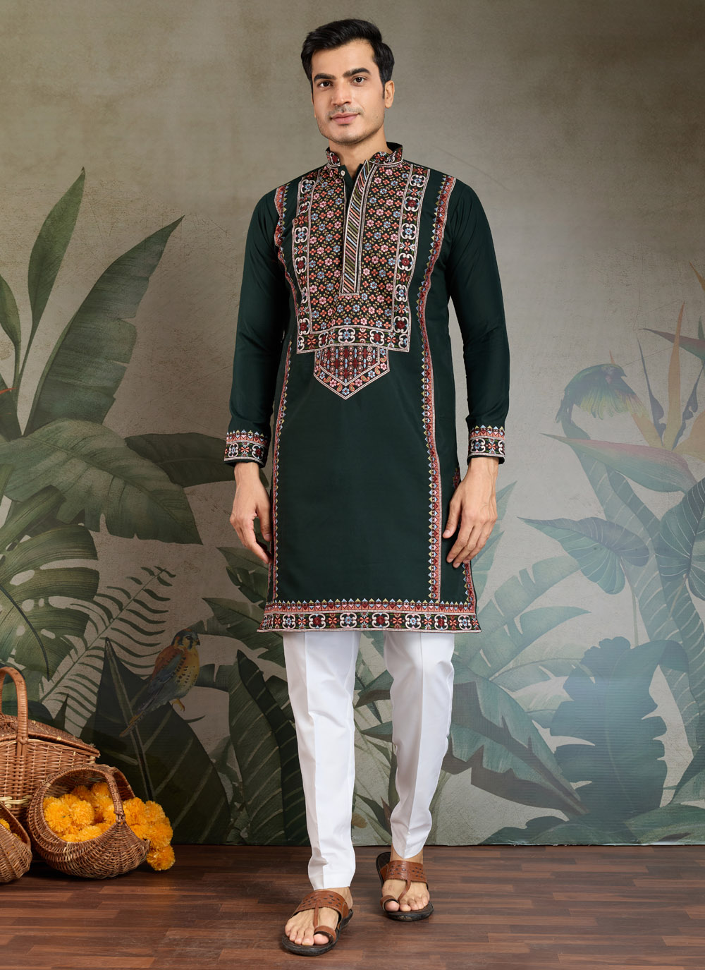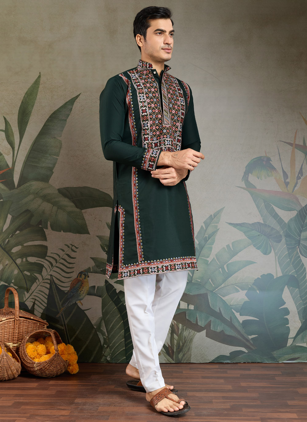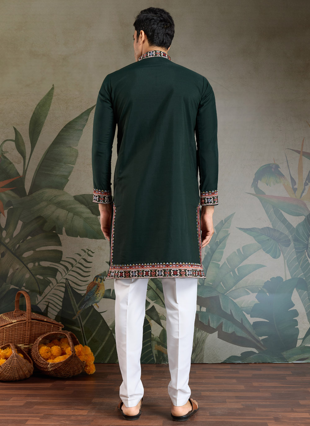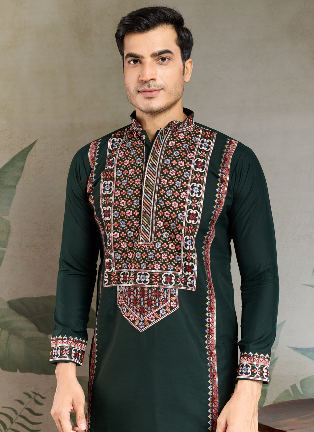 Radiate elegance with this green embroidered kurta, showcasing detailed threadwork and shimmering sequin accents on lustrous viscose silk. A stylish choice for weddings, functions, or formal gatherings.