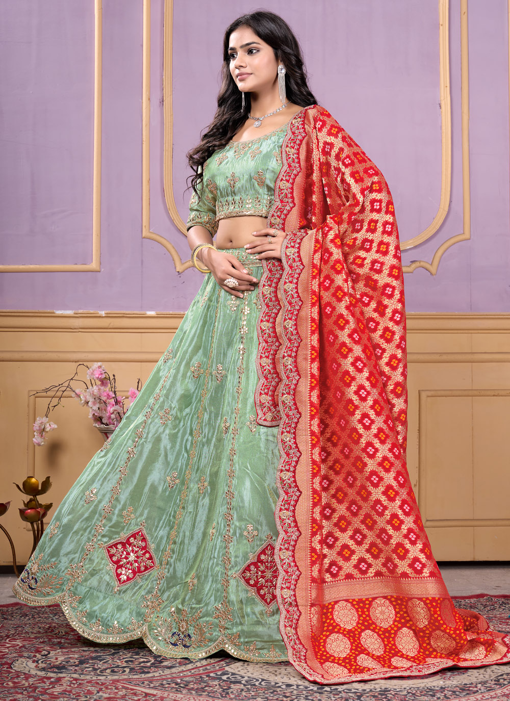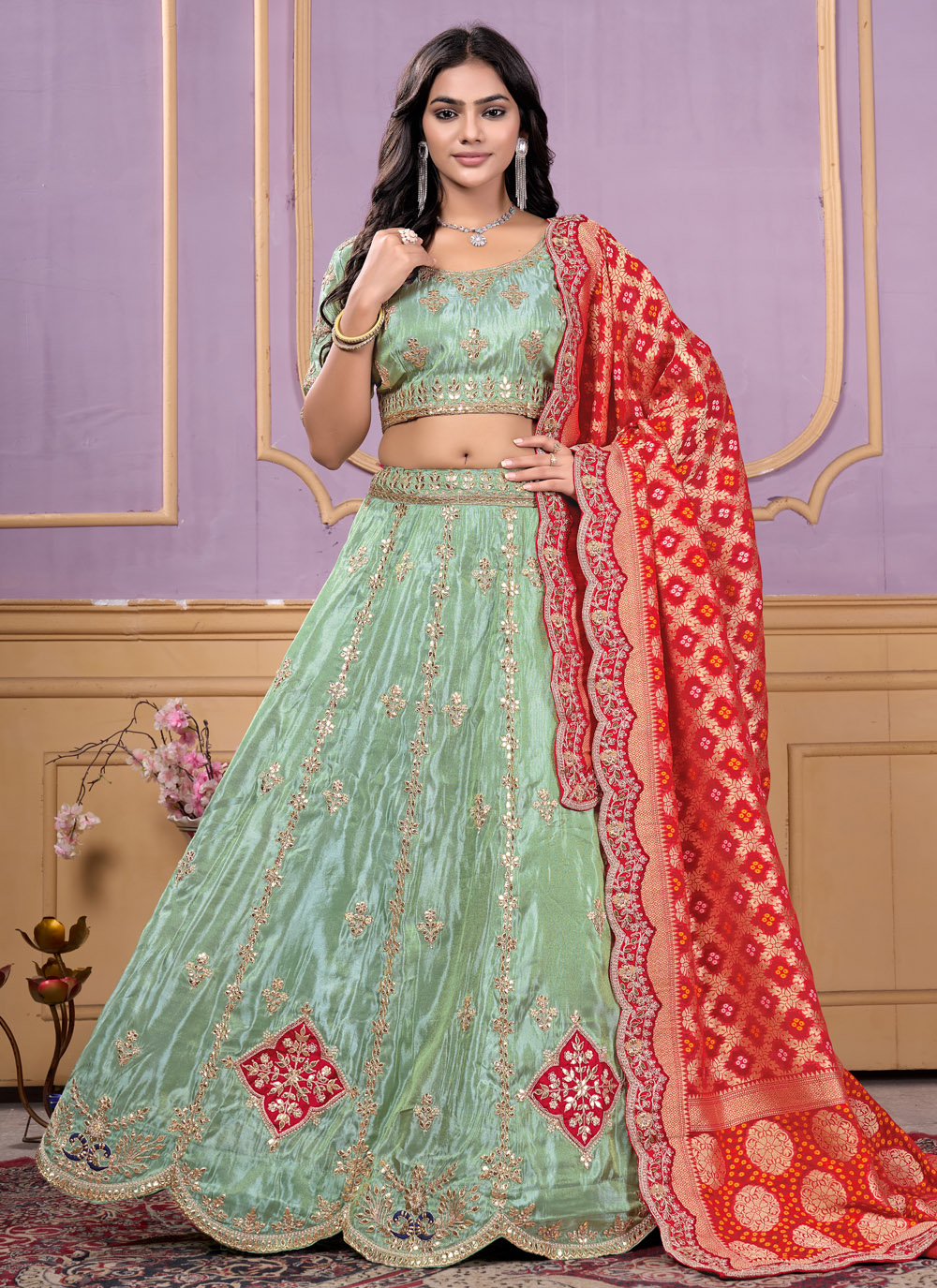 Make an unforgettable impression in this trendy green lehenga choli, featuring delicate thread work and shimmering sequins embroidery. The viscose fabric provides a flattering drape and comfort, ideal for weddings, sangeet, and festive gatherings. Comes with matching choli and dupatta.