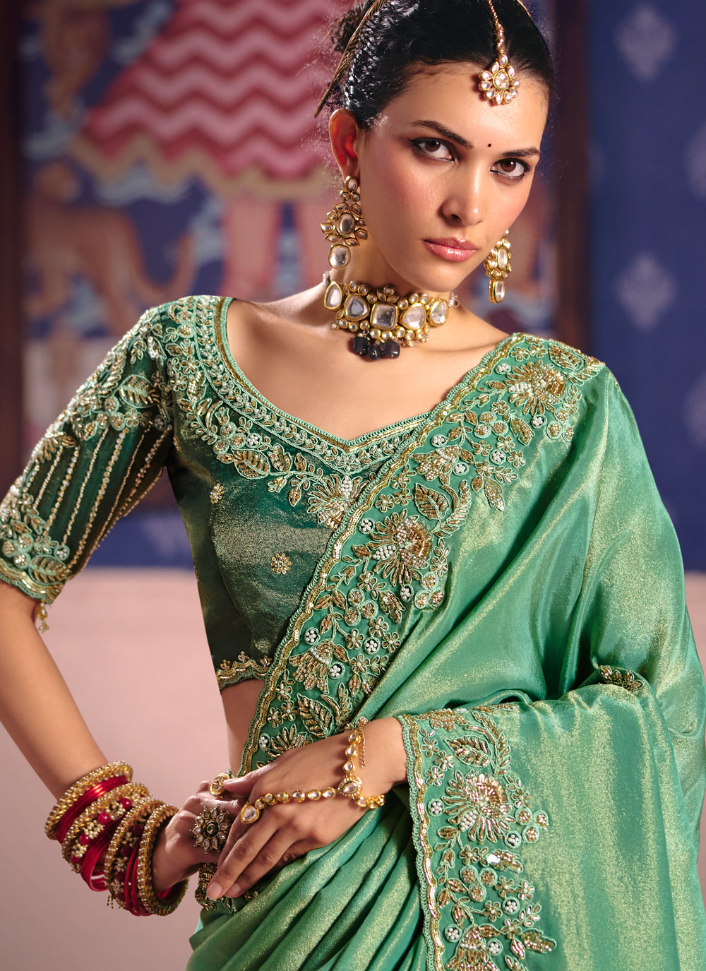 Crafted with premium viscose tissue silk, this green traditional saree features intricate embroidery that highlights its luxurious appeal. The graceful drape and vibrant tone provide a refined look. Comes with matching blouse.