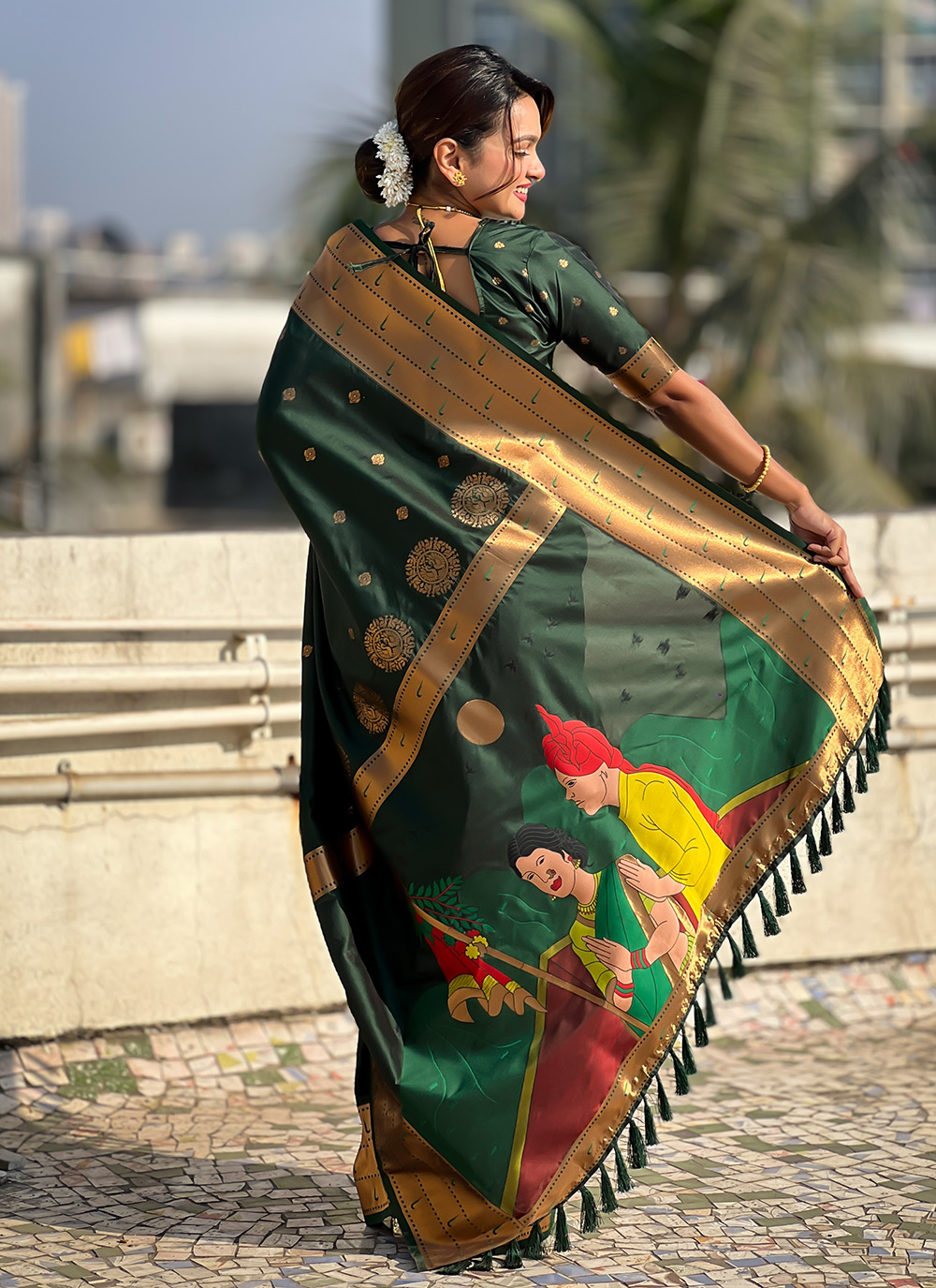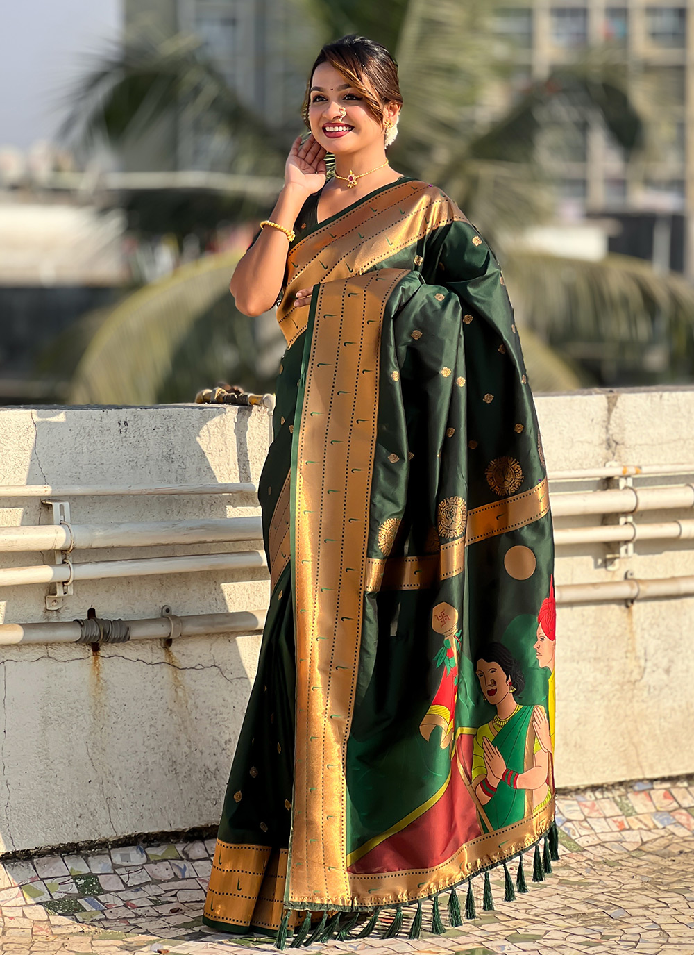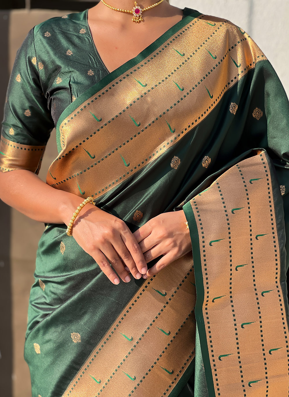 The Green Weaving Silk Stylish Saree for Women, paired with a matching blouse, offers a luxurious and elegant look. The intricate weaving adds depth and texture to the rich green fabric, making it perfect for weddings, parties, and festive occasions. This saree combines traditional charm with modern style, ensuring you stand out in every gathering.