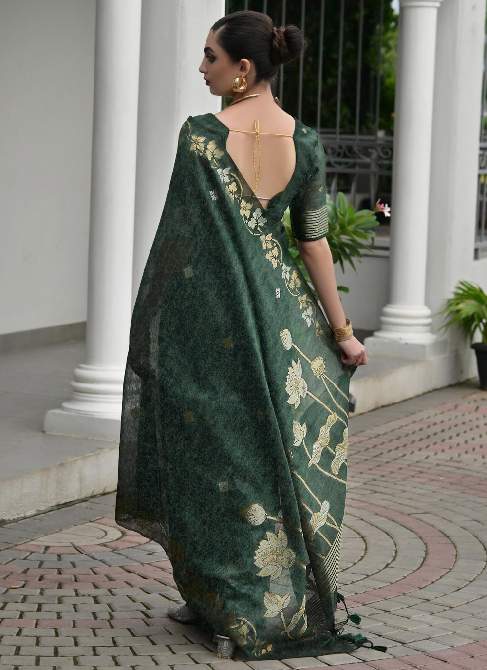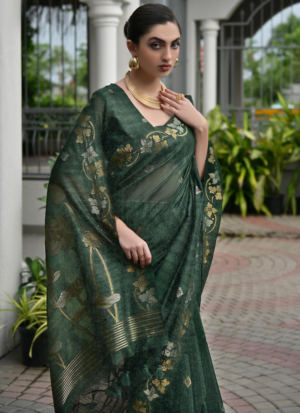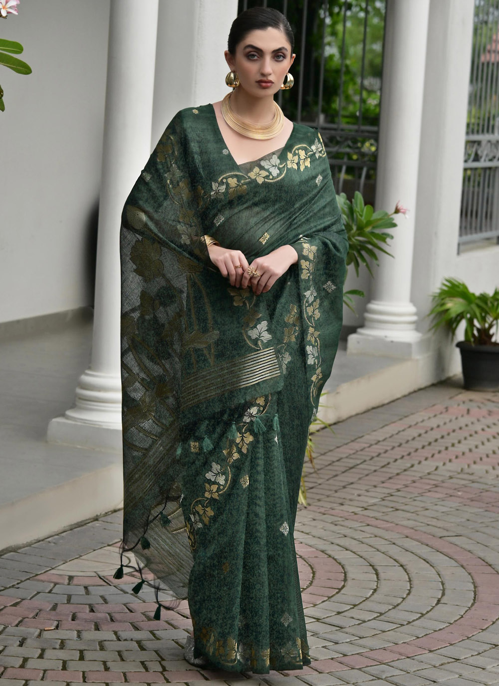 Enhance your ethnic collection with this Green Linen Silk Saree with Zari Weaving Work. The linen silk blend offers a soft texture and comfortable drape, while the detailed zari patterns create a refined festive look. Comes with matching blouse.