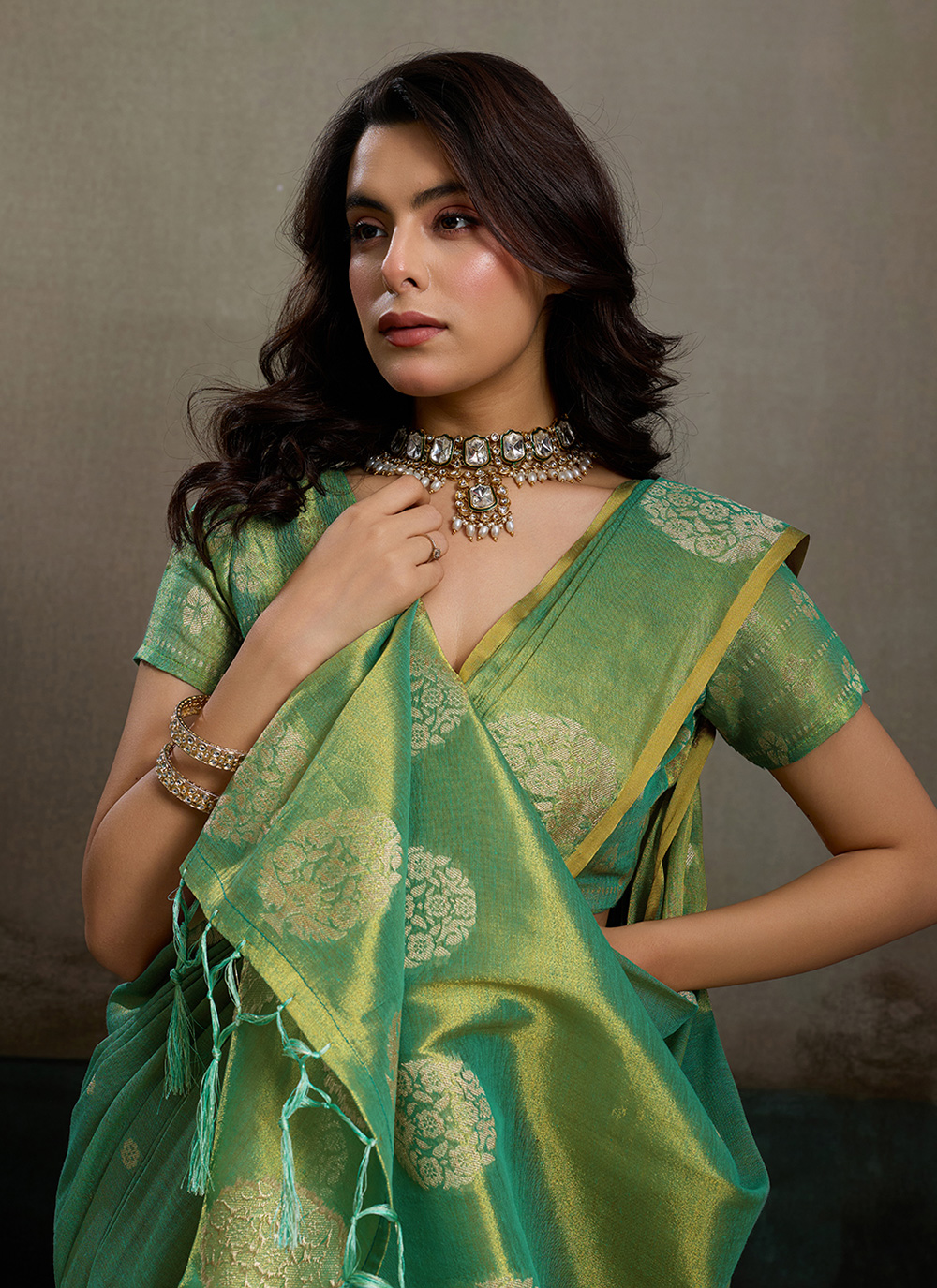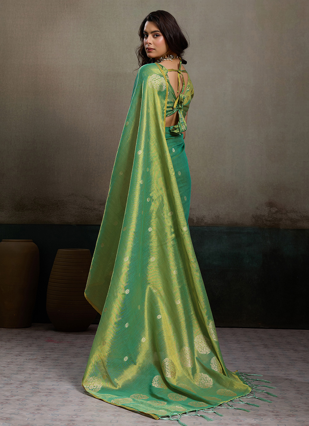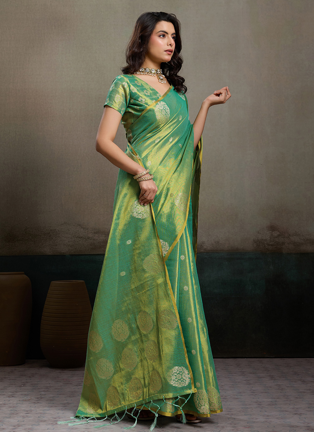 Designed to express cultural grace, this green tissue silk saree showcases intricate woven work that enhances its classic beauty. The elegant drape and vibrant tone make it ideal for ceremonies and festive celebrations. Comes with matching blouse.