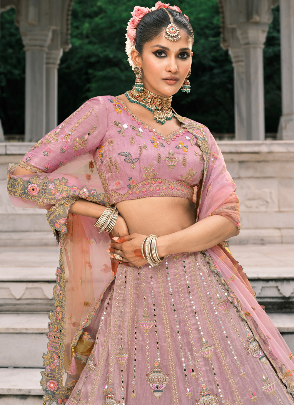 This grey and pink silk lehenga choli is a masterpiece that blends subtle tones with dazzling artistry. Embellished with mirror work, sequins, and stone embroidery, it shimmers with every movement. Designed with a modern edge. Comes with matching choli and dupatta.