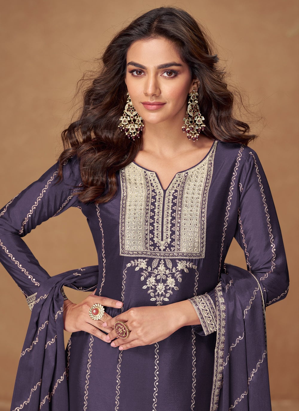 This Grey Chinon Salwar Suit is tailored for ceremonial charm. The soft drape of the fabric combined with intricate embroidery makes it an effortless choice for cultural events, weddings or rituals. Comes with matching bottom and dupatta.